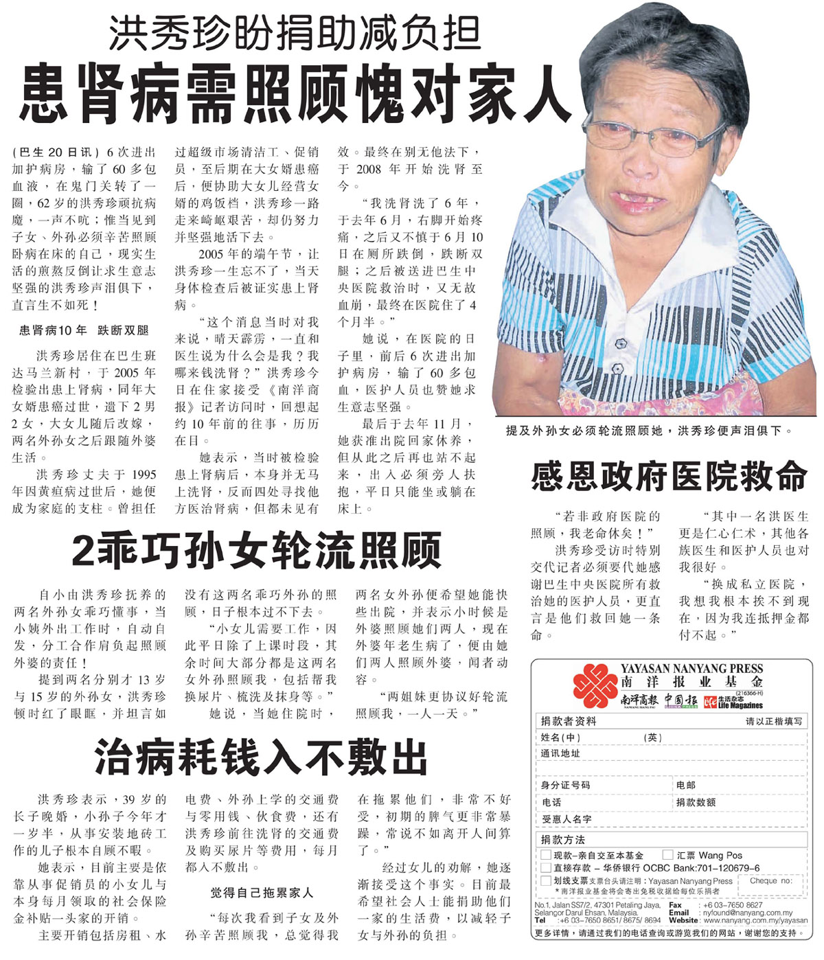 Age 年龄: 61 Condition 病情: Since 2005, Ang has been suffering from kidney disease and receiving treatments. Last June, due to feet pain, Ang accidentally fell in the toilet and broke her legs, and had to be hospitalised for four months. In view of Ang’s small household income and rising dialysis costs, Yayasan Nanyang Press wishes to raise funds to solve Ang’s family’s financial problems. 2005年患上腎病的洪秀珍於去年6月因雙腳疼痛,不慎在廁所跌倒、跌斷雙腿住院4個月。一家六口主要經濟收入介靠小女兒與每月領取的社險來補貼一 家的開銷,但洗腎的費用等卻逐年增漲,造成本已經入不敷出的一家再次陷入經濟危機,洪秀珍祈求社會人士能夠慷慨解囊捐助他們一家的生活費,以減輕 子女的負擔。 Links: – Article: Nanyang Siang Pau – Donor List |