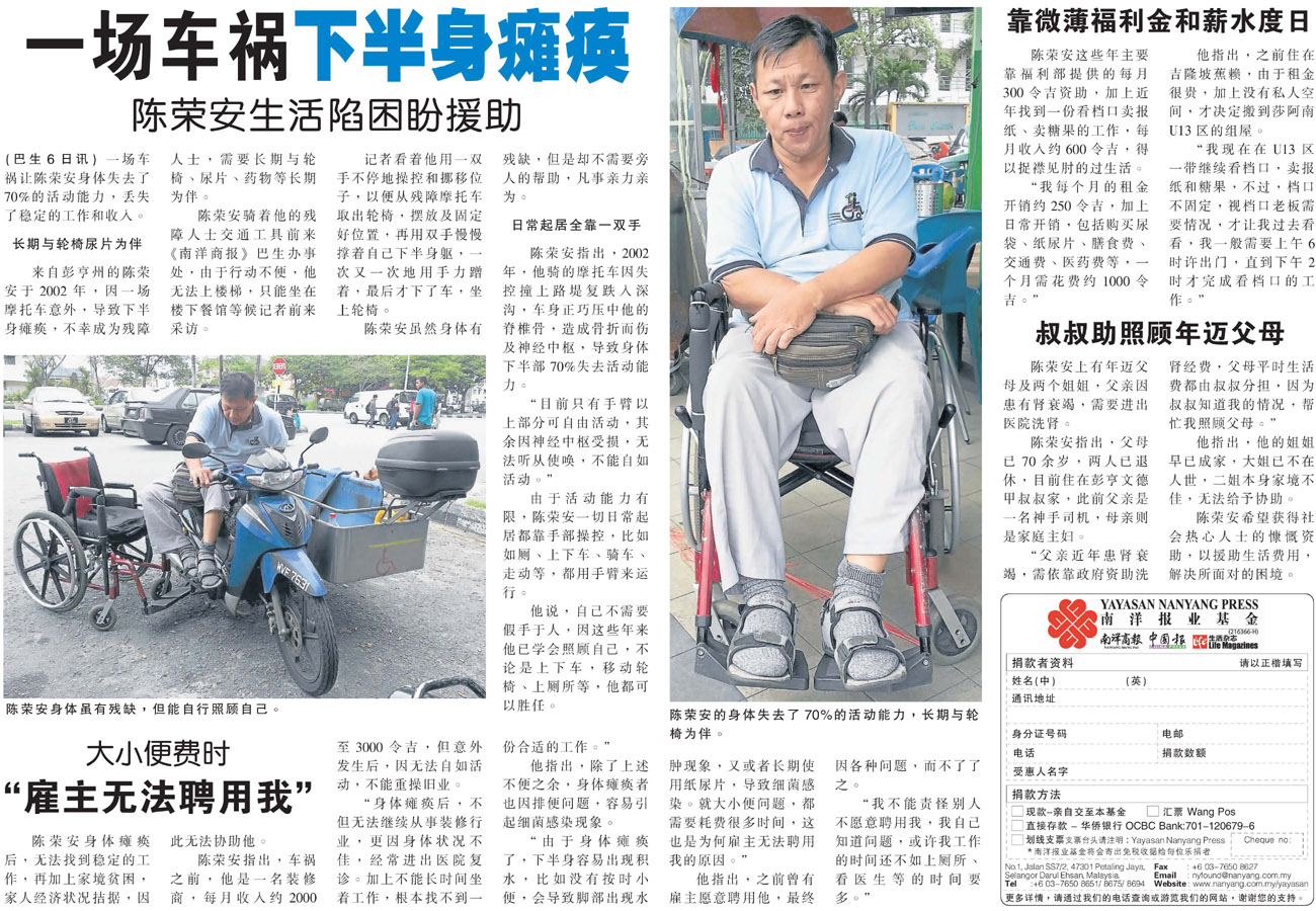 Age 年龄: 47 Condition 病情: 一场车祸让陈荣安身体失去70%的活动能力,丢失了稳定的工作和收入,成了残障人士,需要长期与轮椅、尿片、药物等做伴。 希望获得社会热心人士的慷慨解囊,以援助生活费用,解决所面对的困境。 Links: – Donor List |