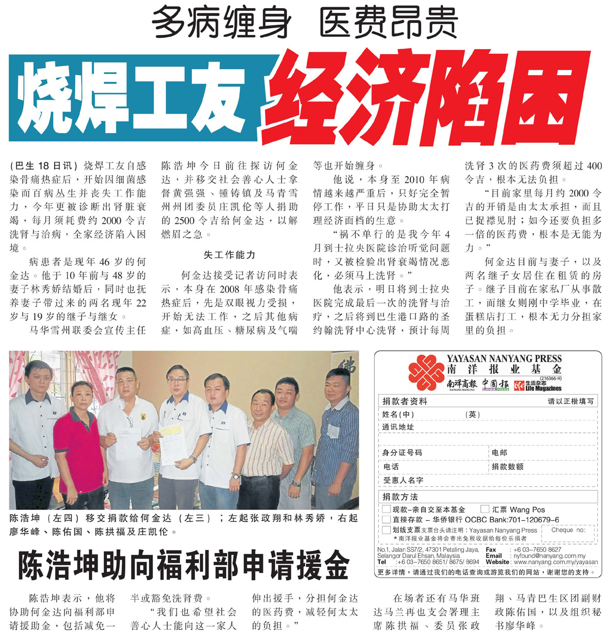 Age 年龄: 46 Condition 病情: 烧焊工友自感染骨痛热症后,开始因细菌感染而百病丛生并丧失工作能力,今年更被诊断出肾脏衰竭,每月需花费约RM2000洗肾与治病,全家经济陷入困境。 Links: – Article: Nanyang Siang Pau – Donor List |