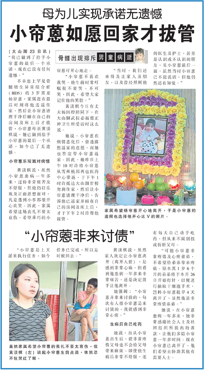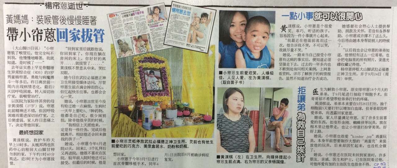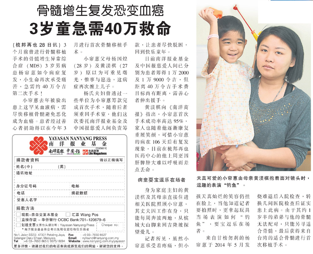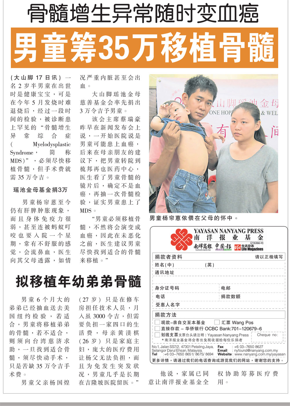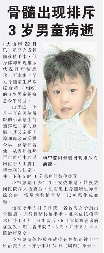 Age 年龄: 2 Condition 病情: 患有骨髓增生异常综合症。 Links: – Donor List – 骨髓出现排斥,3岁男童病逝 – 小帘蒽如愿回家才拔管 – 带小帘蒽回家拔管 |