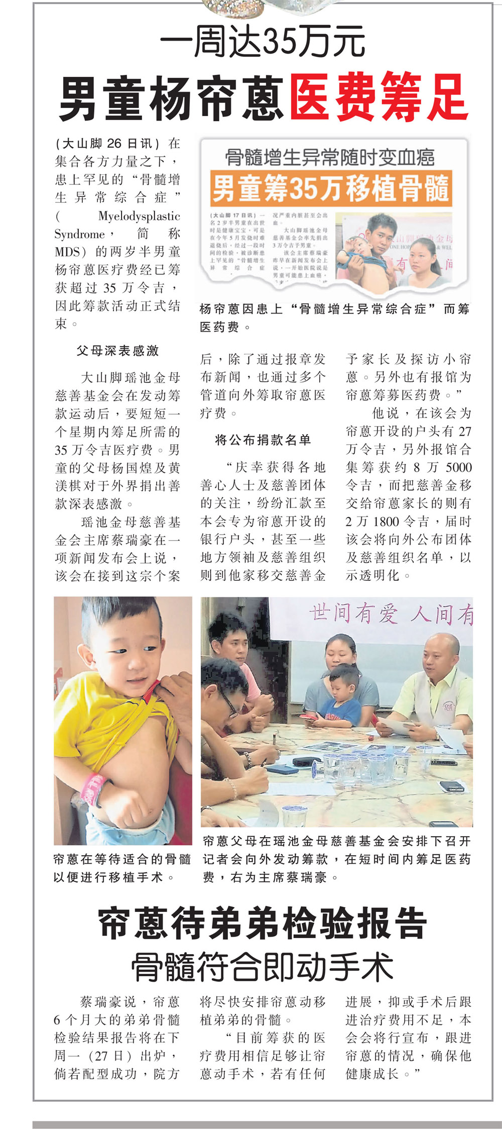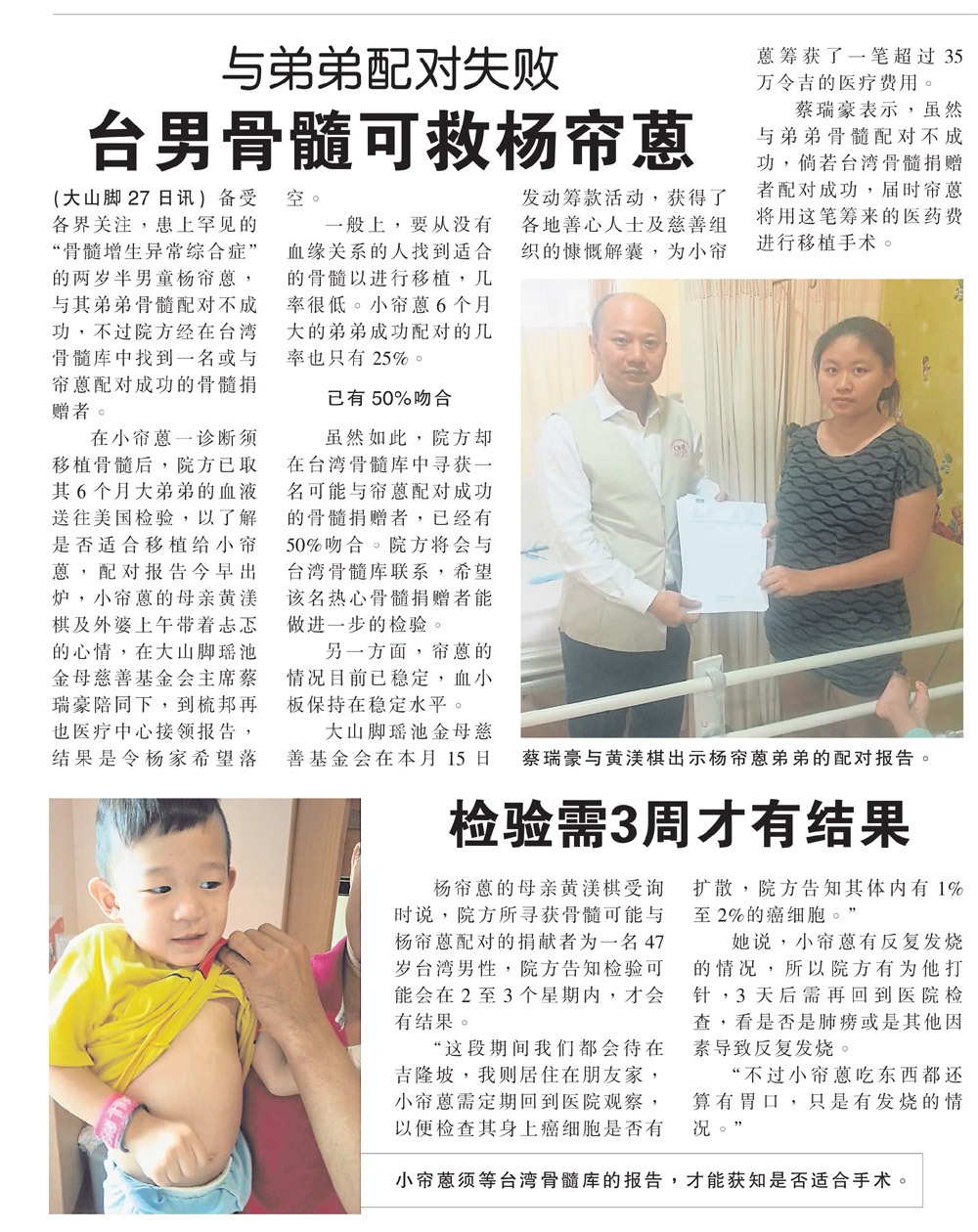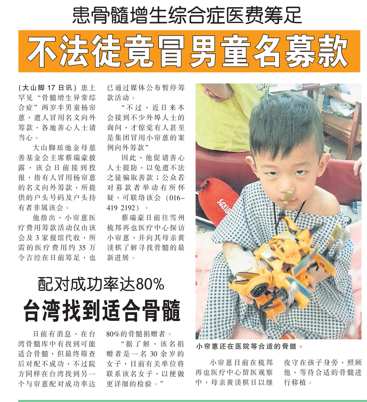 Age 年龄: 2 Condition 病情: 患有骨髓增生异常综合症。 Links: – Donor List – 骨髓出现排斥,3岁男童病逝 – 小帘蒽如愿回家才拔管 – 带小帘蒽回家拔管 |