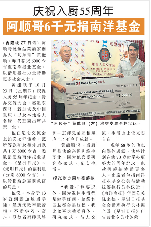 28 November 2014 - 阿顺哥6千元捐南洋报业基金Posted under news ·