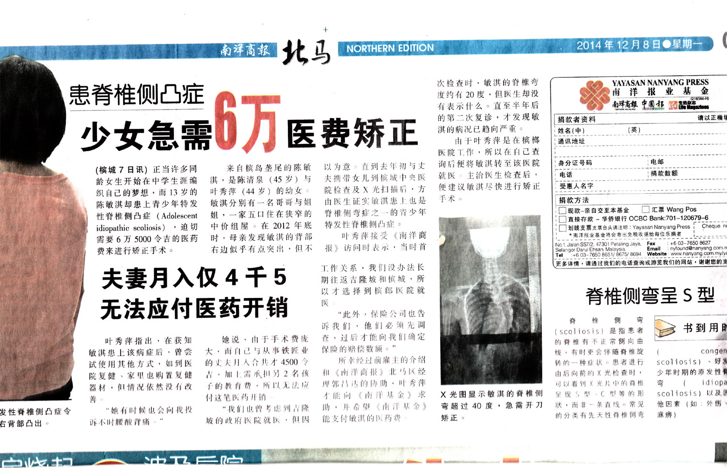 Age 年龄: 13 Condition 病情: 患青少年特发性脊椎侧凸症,迫切需要 RM65000 进行矫正手术。 夫妻俩月入都花在复健和复健器材之外,还需要承担另外两名孩子的教育费,加上手术费庞大,他们根本无法应付这笔医药开销。希望大众能够慷慨解囊,帮助他们减轻医药费负担。 Links: – Donor List |