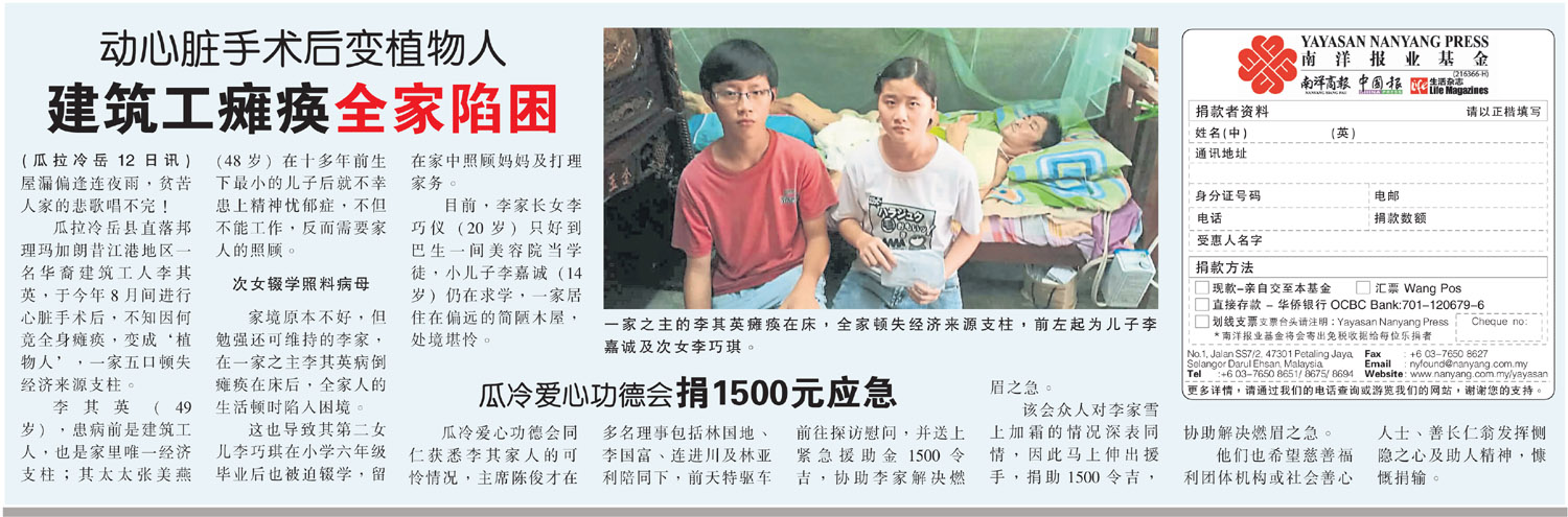 Age 年龄: 13 Condition 病情: 一家之主的李其英进行心脏手术之后,不知因何竟全身瘫痪,变成植物人,全家顿失经济来源支柱,希望大众能够慷慨解囊,帮助减轻他们经济上的负担。 Links: – Donor List |