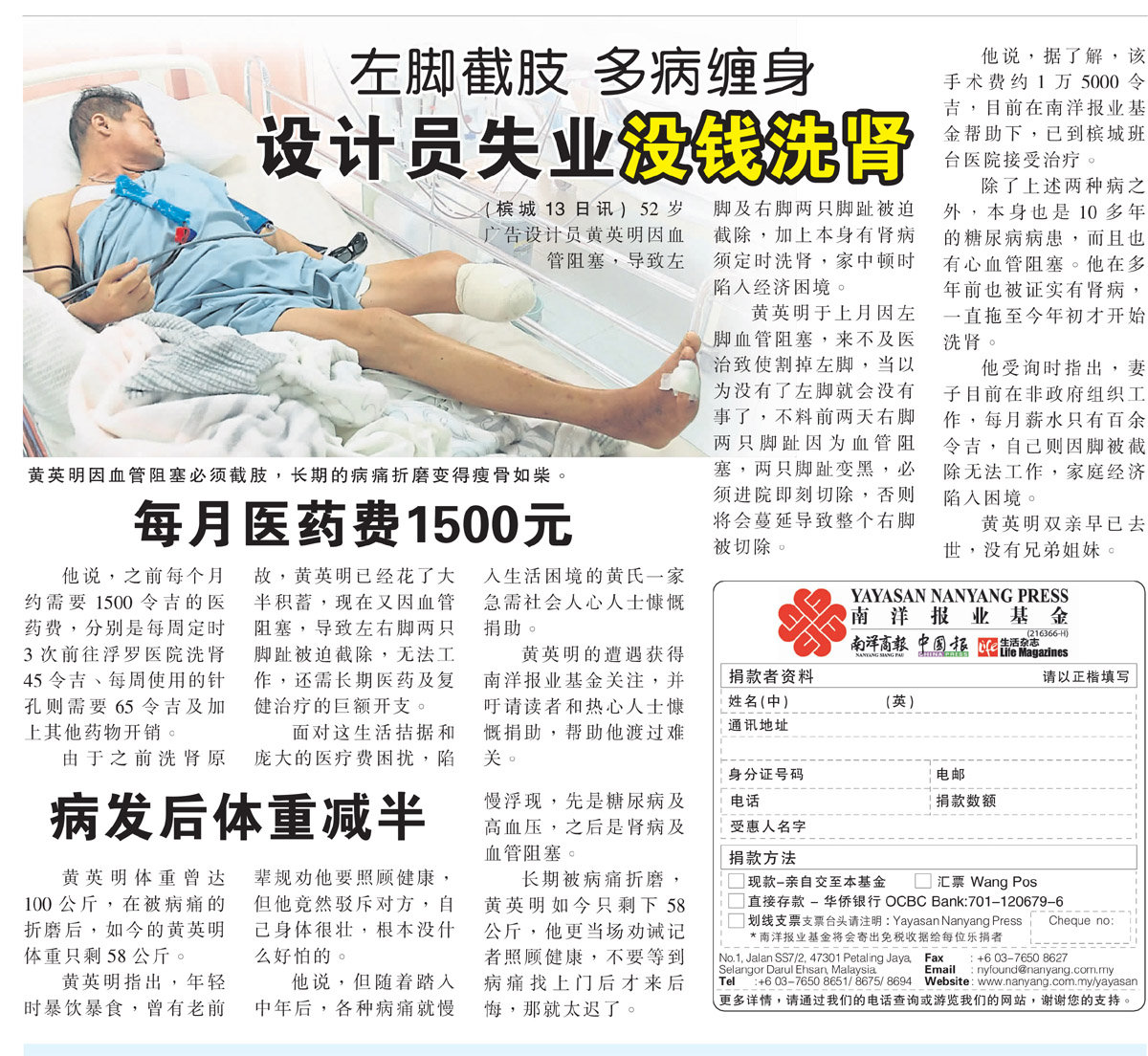 Age 年龄: 52 Condition 病情: 黄英明因血管阻塞导致左脚和右脚两只脚趾被截肢,长期的病痛折磨让他变得瘦骨如材,加上又患有肾病,根本无法工作,面对生活拮据。希望大众能够慷慨解囊,帮助减轻医药费负担。 Links: – Donor List |