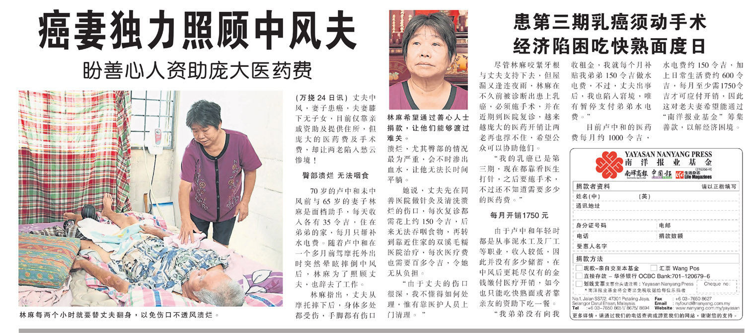 Age 年龄: 70 Condition 病情: 丈夫中风,妻子患癌,夫妻膝下无子女,庞大的医药费及手术费让两老陷入愁云惨境 Links: – Article: Nanyang Siang Pau – Donor List |