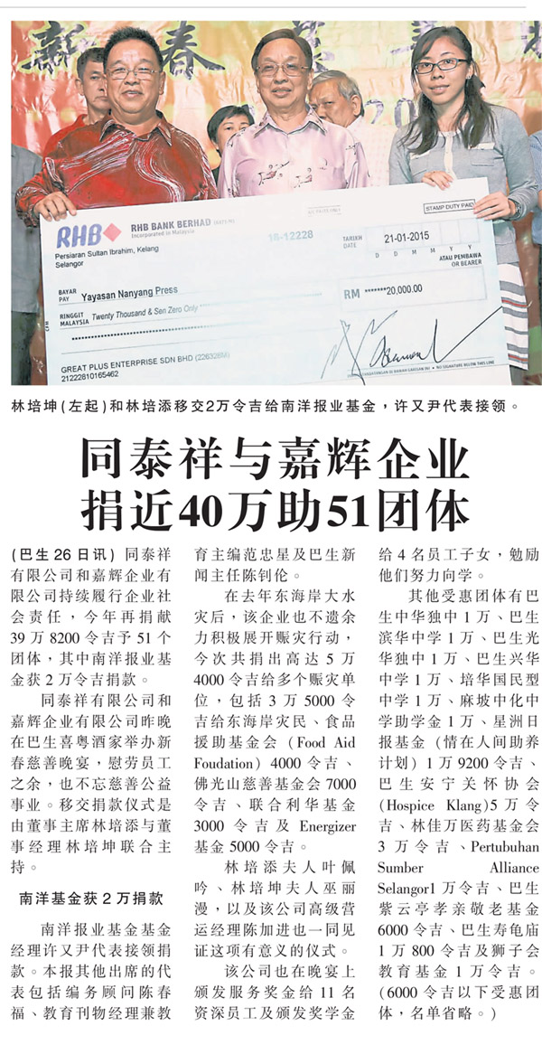 27 January 2015 - 捐近40万助51团体Posted under news ·Source: Nanyang Siang Pau