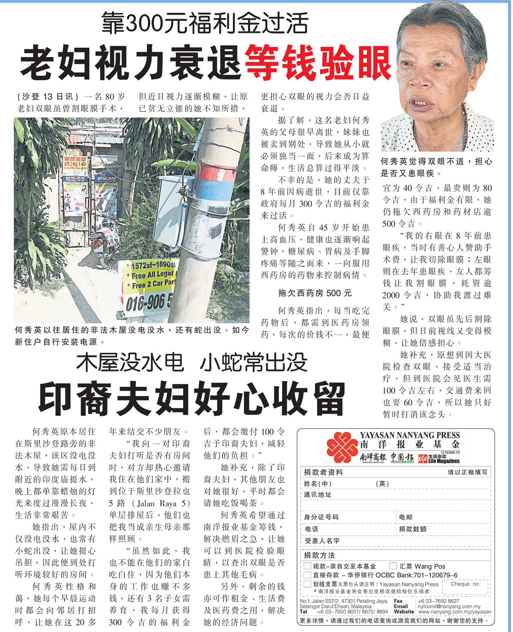 Age 年龄: 80 Condition 病情: 老妇双眼虽曾割眼膜手术,但视力逐渐模糊,原已贫无立锥的不知所措,更担心双眼视力会否日益衰退。 Links: – Article: Nanyang Siang Pau – Donor List |