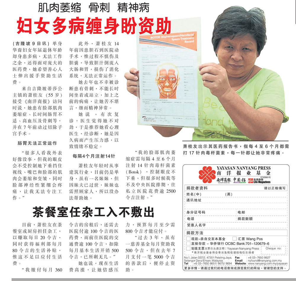 Age 年龄: 55 Condition 病情: 单身华裔妇女年届退休年龄却身患多病,无法工作之余,还得面对庞大的医药费,她希望善心人士伸出援手资助生活费. Links: – Article: Nanyang Siang Pau – Donor List |