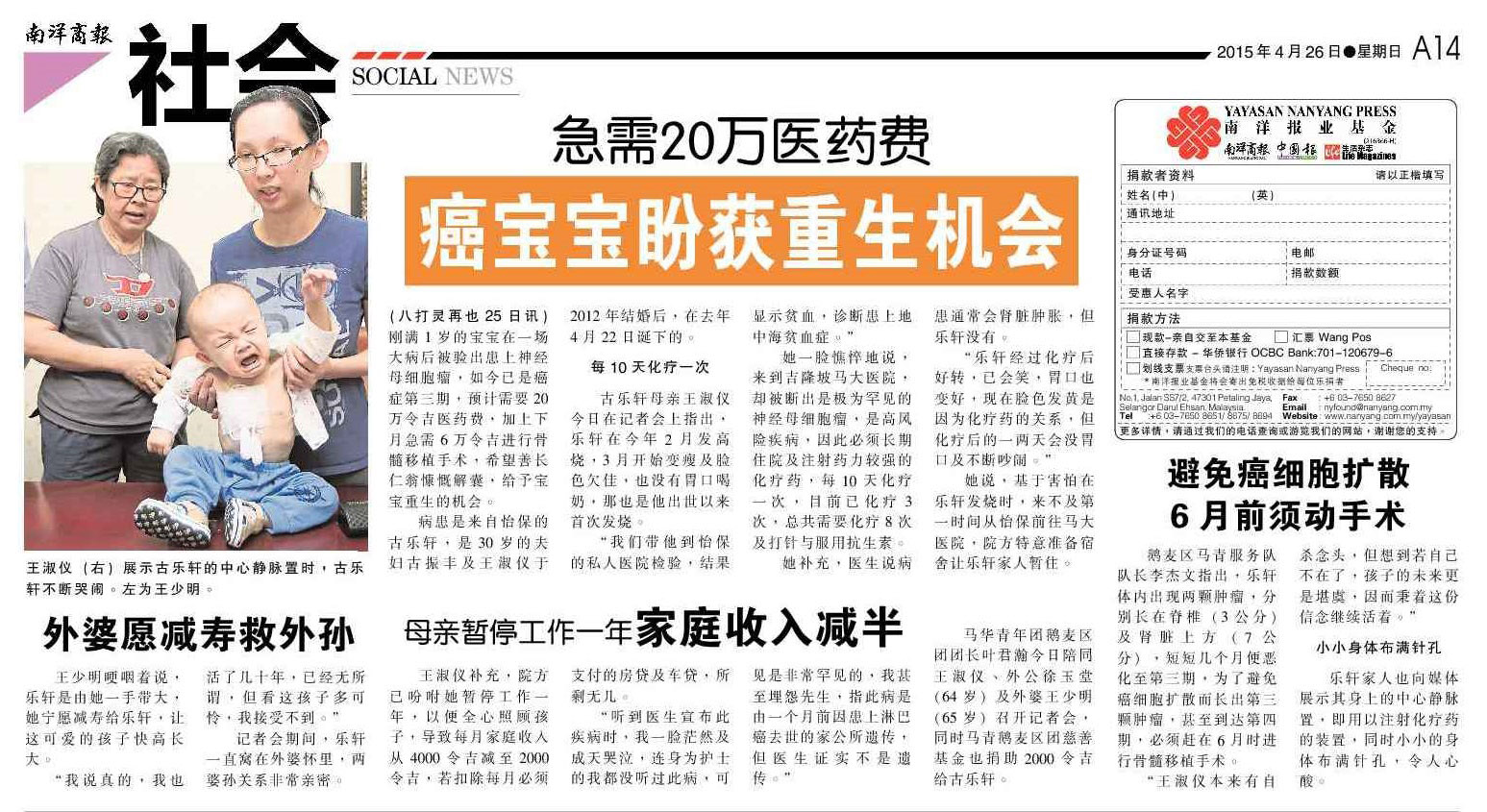 为此,古乐轩的家人希望能透过南洋报业基金登报筹款,以支付医药费。