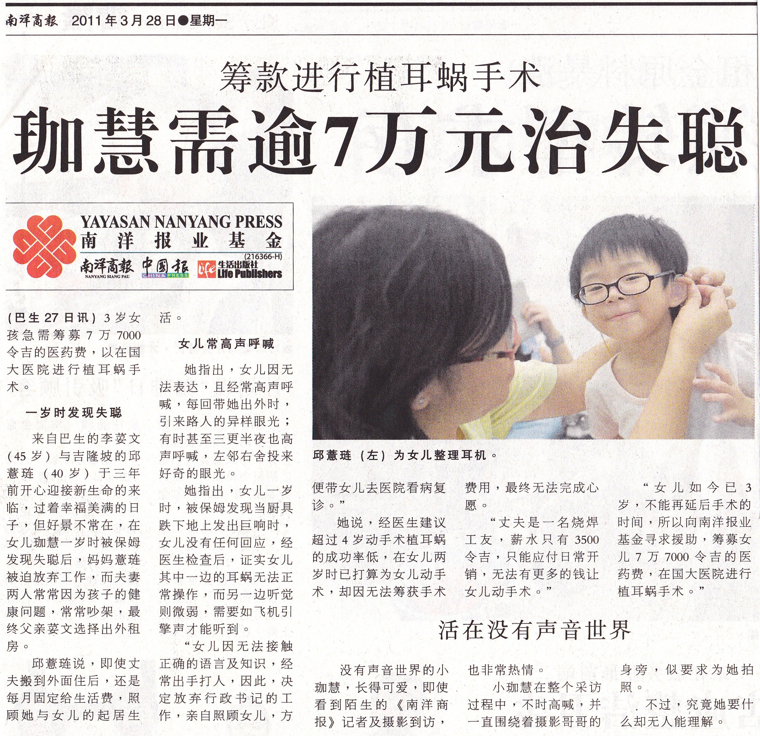 Yayasan Nanyang Press had successfully raised RM34,052.15 for Lee Ka Wei. RM12.000.00 has been used for her ear surgery. Yayasan is paying RM480.00 every month for her language therapy class. The balance of the donations up to 01/04/2013 are RM18,212.15. Yayasan would like to thank you for your continuous support.