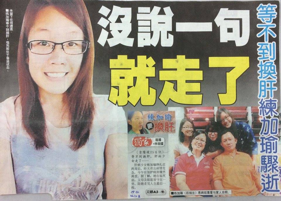 肝病少女練加瑜日前才傳出病情危急,昨日(25/02/2016)却在加護病房中驟然離世,臨死前父母及姐姐皆在一旁,陪她走完人生最后一程!