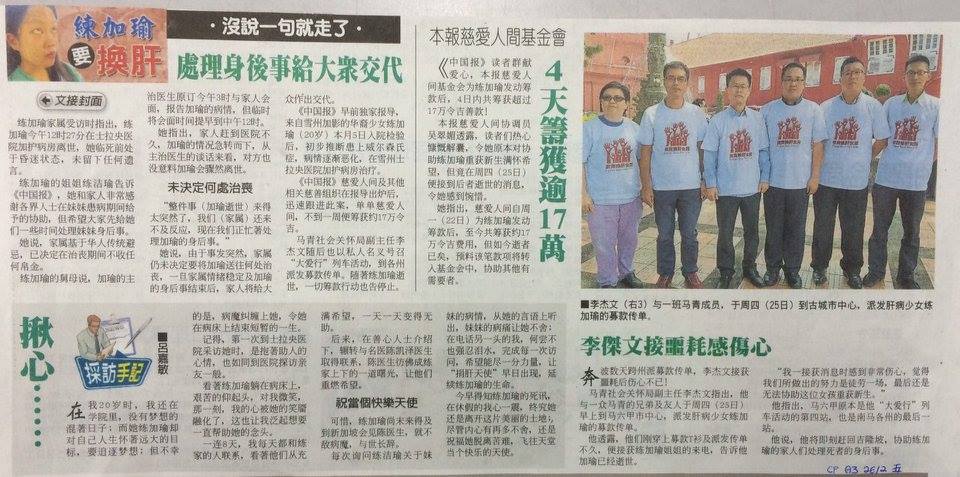 患上威尔森氏症的练加瑜(20岁),不幸於2月25日往生后,她的家属决定将《南洋报业基金》 筹到的 RM 595,830.00 义款,转捐给患先天性下肢畸形症的李晋毅(1岁6个月),让已故练加瑜继续遗爱人间。