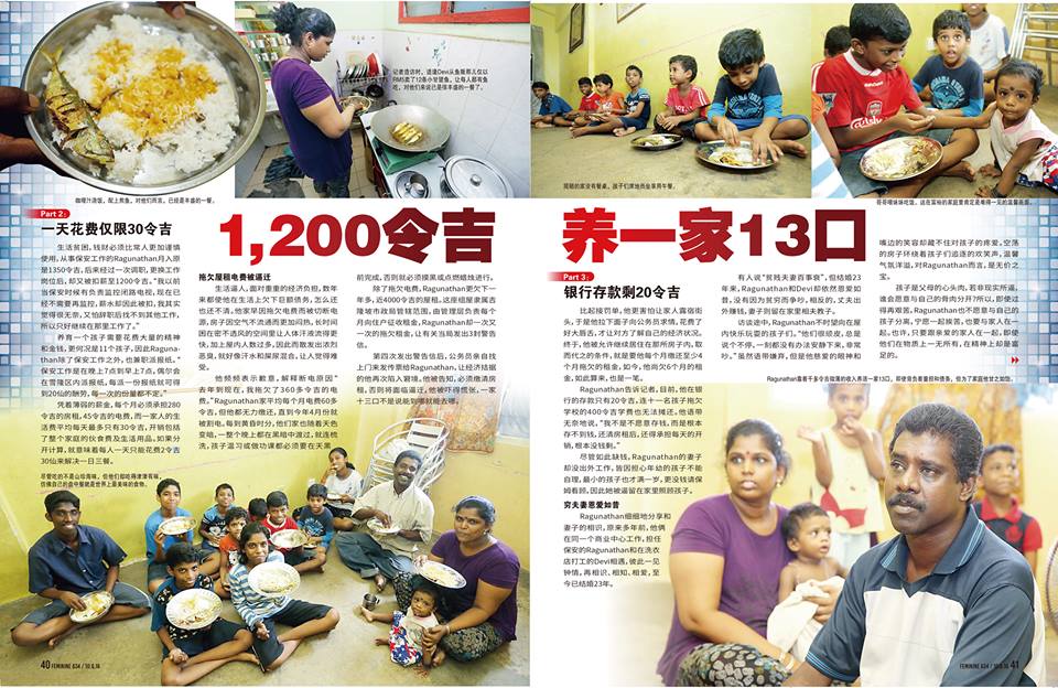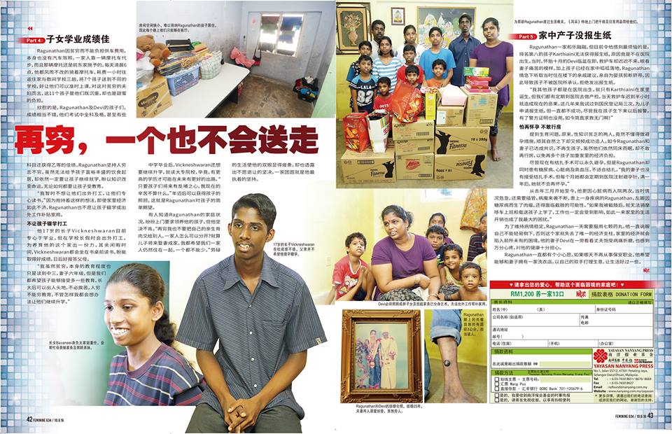 患有糖尿病、心脏病和高血压的Ragunathan(保安人员),每月只依靠RM1200微薄薪水以养活家中11名孩子和妻子。11名孩子之中,年纪最大的就只有17岁,而最小的也只是1岁,虽然家境贫困,但Ragunathan并没有放弃孩子的学习机会,从来没有让孩子放弃学业。