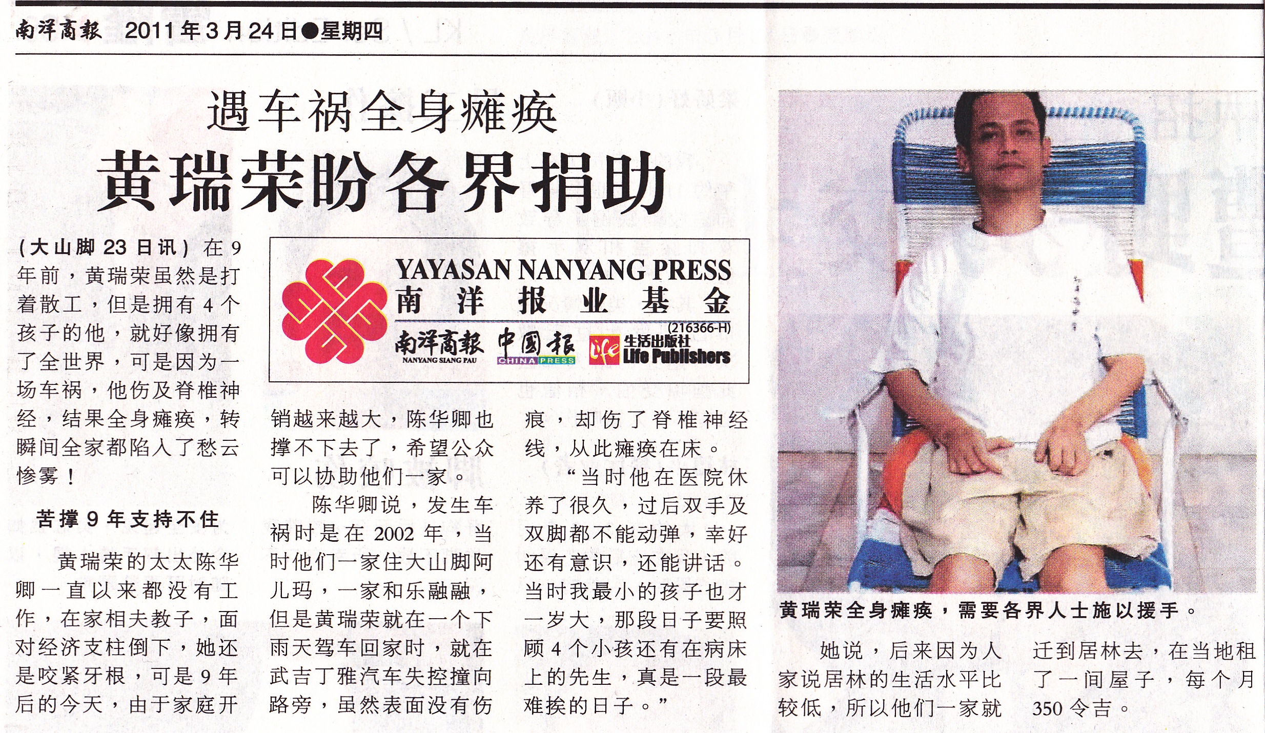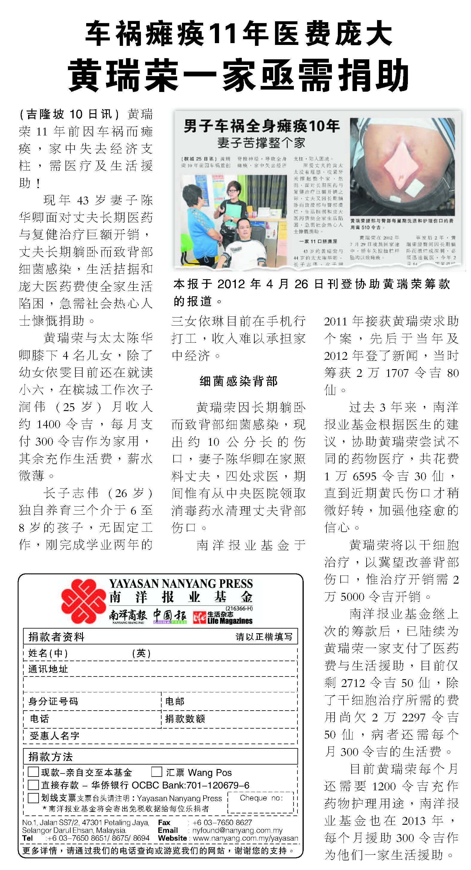 Age: – Condition: Unable to move both upper and lower limbs due to the cause of accident 9 years ago. Links: – Donor List |
