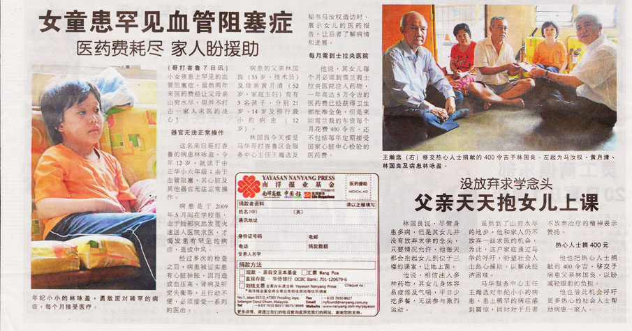 Age: 12 Condition: 罕见病证,心脏肿胀,高血压,肾病,听觉失衡,行动不便 Links: – Article: Nanyang Siang Pau – Donor List |