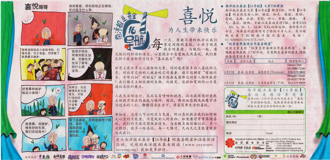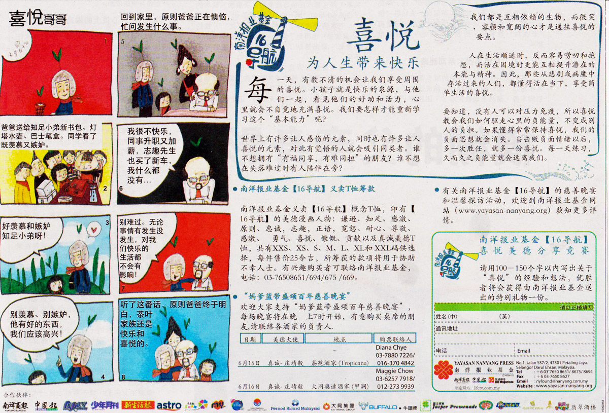 南洋报业基金义卖【16导航】概念T恤,印有【16导航】的美德漫画人物:谦逊、知足、感激、原则、忠诚,志趣,正语,宽恕、耐心、尊敬、感激、 勇气、喜悦、慷慨、贡献以及真诚美德T恤,共有XXS、XS、S、M、L、XL和 XXL码供选择,每件售价25令吉,所筹获的款项将用于协助不幸人士。有兴趣购买者可联络南洋报业基金,电话: 03-76508651/694/675/669。