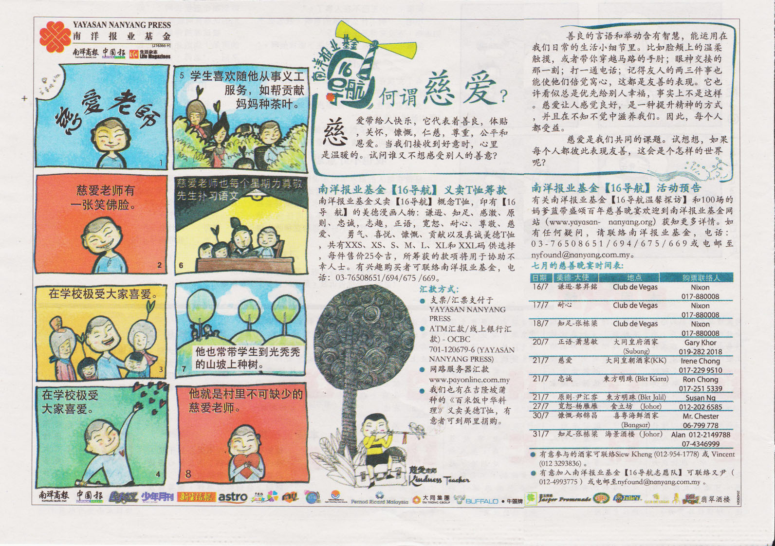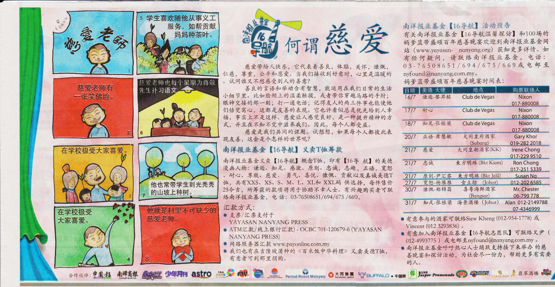 南洋报业基金义卖【16导航】概念T恤,印有【16导航】的美德漫画人物:谦逊、