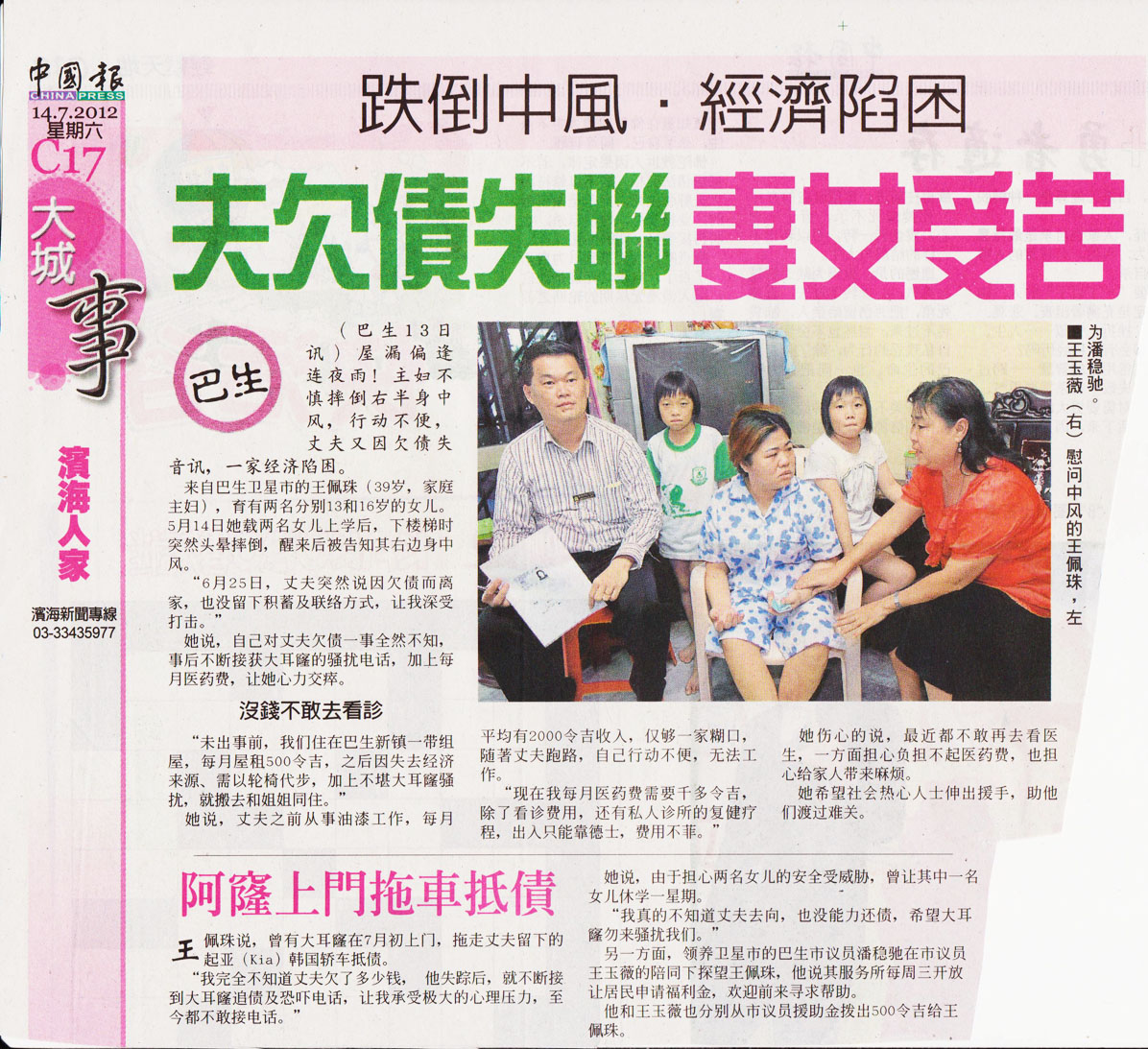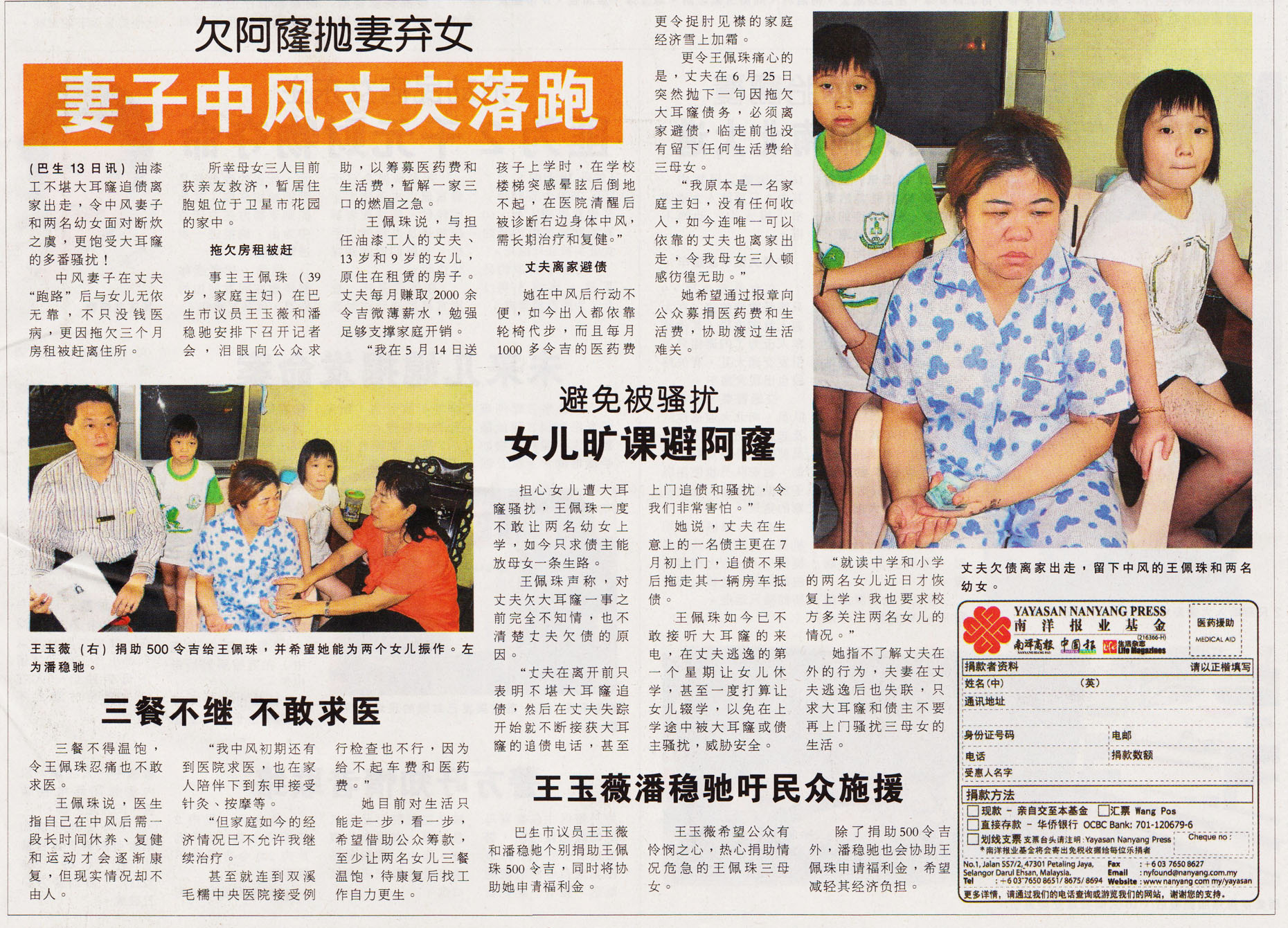 Age: 39 Condition: 中风,丈夫欠债离家出走,拖欠屋租被赶。 Links: – Article: Nanyang Siang Pau – Article: China Press – Donor List |