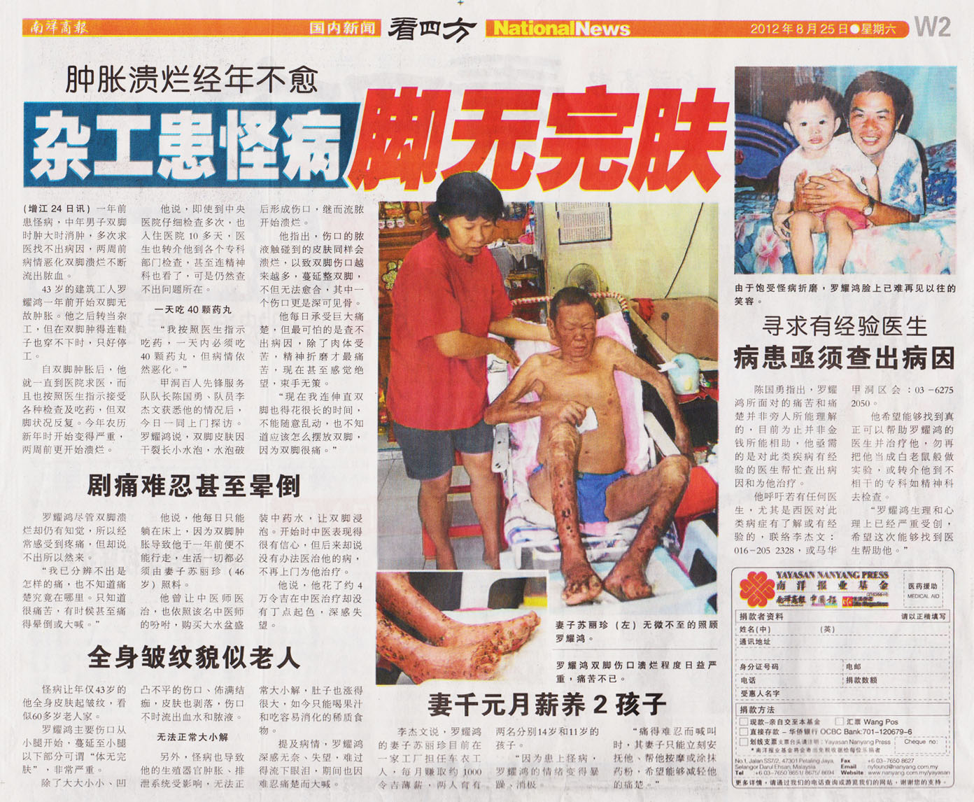 Age: 43 Condition: 肿胀溃烂经年不愈,杂工患怪病脚无完肤。 Links: – Article: Nanyang Siang Pau – Donor List |
