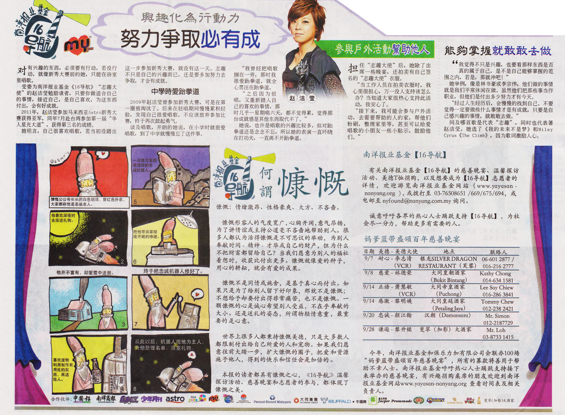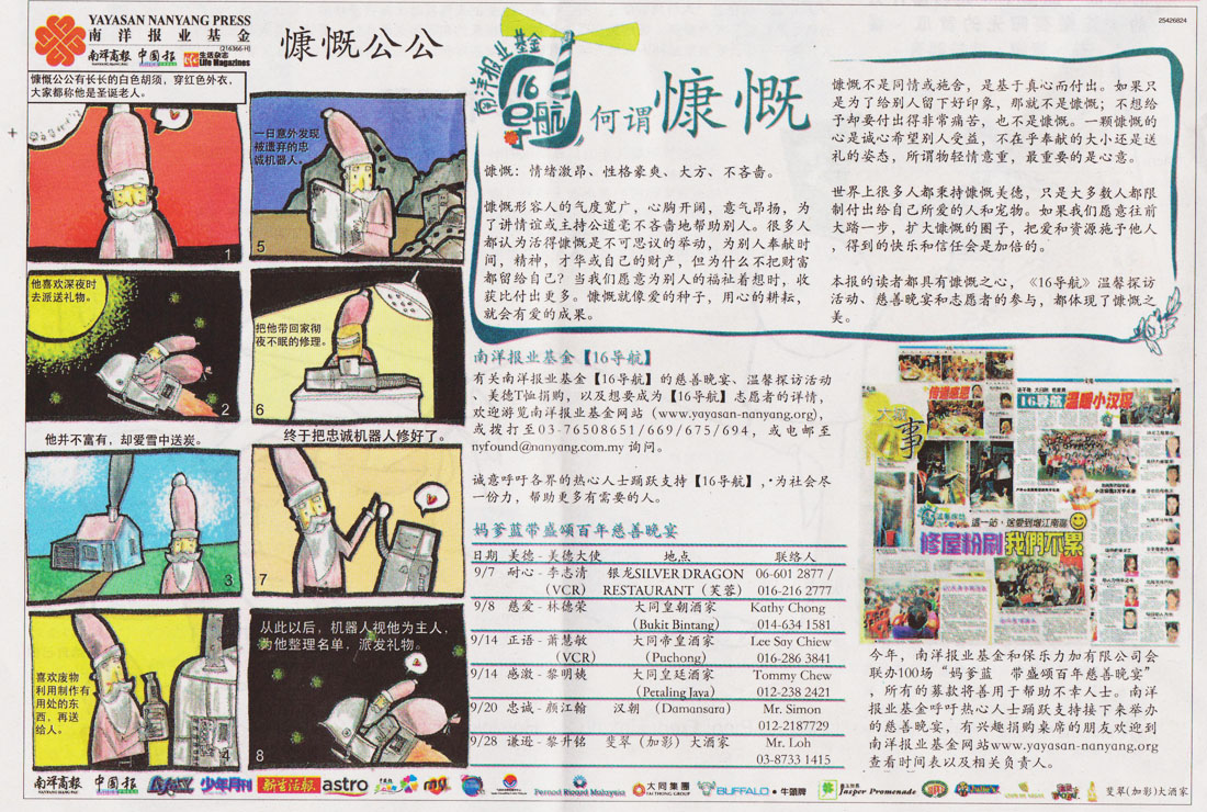本报的读者都具有慷慨之心,《16导航》温馨探访活动就是最好的例子:我们的美德大使愿意付出才华,在慈善晚宴上为筹到更多的款项而表演;赞助商为活动贡献丰富奖品和礼物;志愿者虽然没有能力捐款,但愿意付出时间和精神参与活动,为受惠者打扫家里,粉刷屋子。这些举动都体现了慷慨之美。