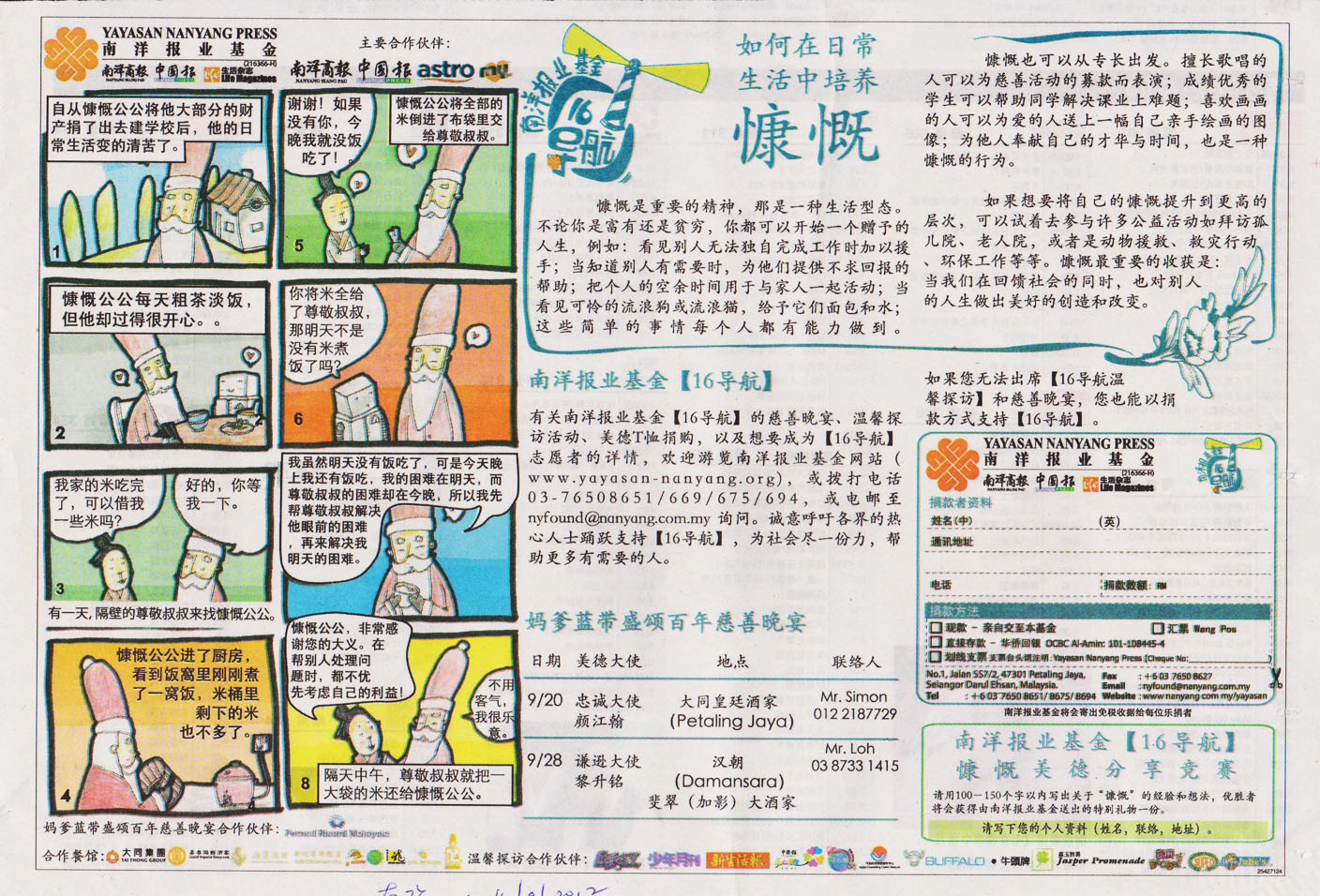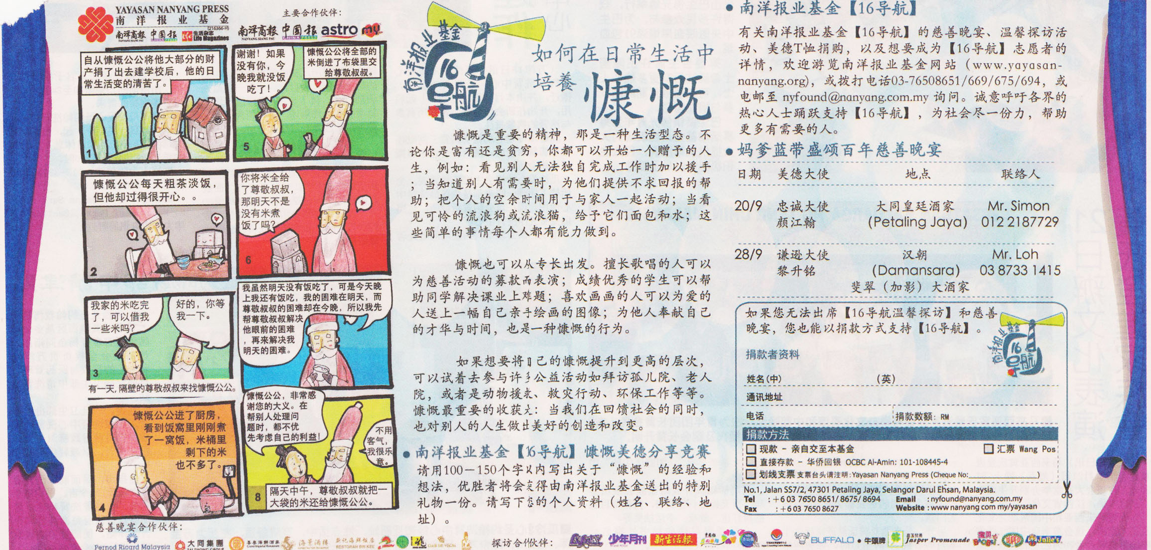 慷慨是重要的精神,那是一种生活型态。不论你是富有还是贫穷,你都可以开始一个赠予的人生,例如:看见别人无法独自完成工作时加以援手;当知道别人有需要时,他们提供不求回报的帮助;把个人的空余时间用于与家人一起活动;当看见可怜的流浪狗或流浪猫,给予它们面包和水;这些简单的事情每个人都有能力做到。
