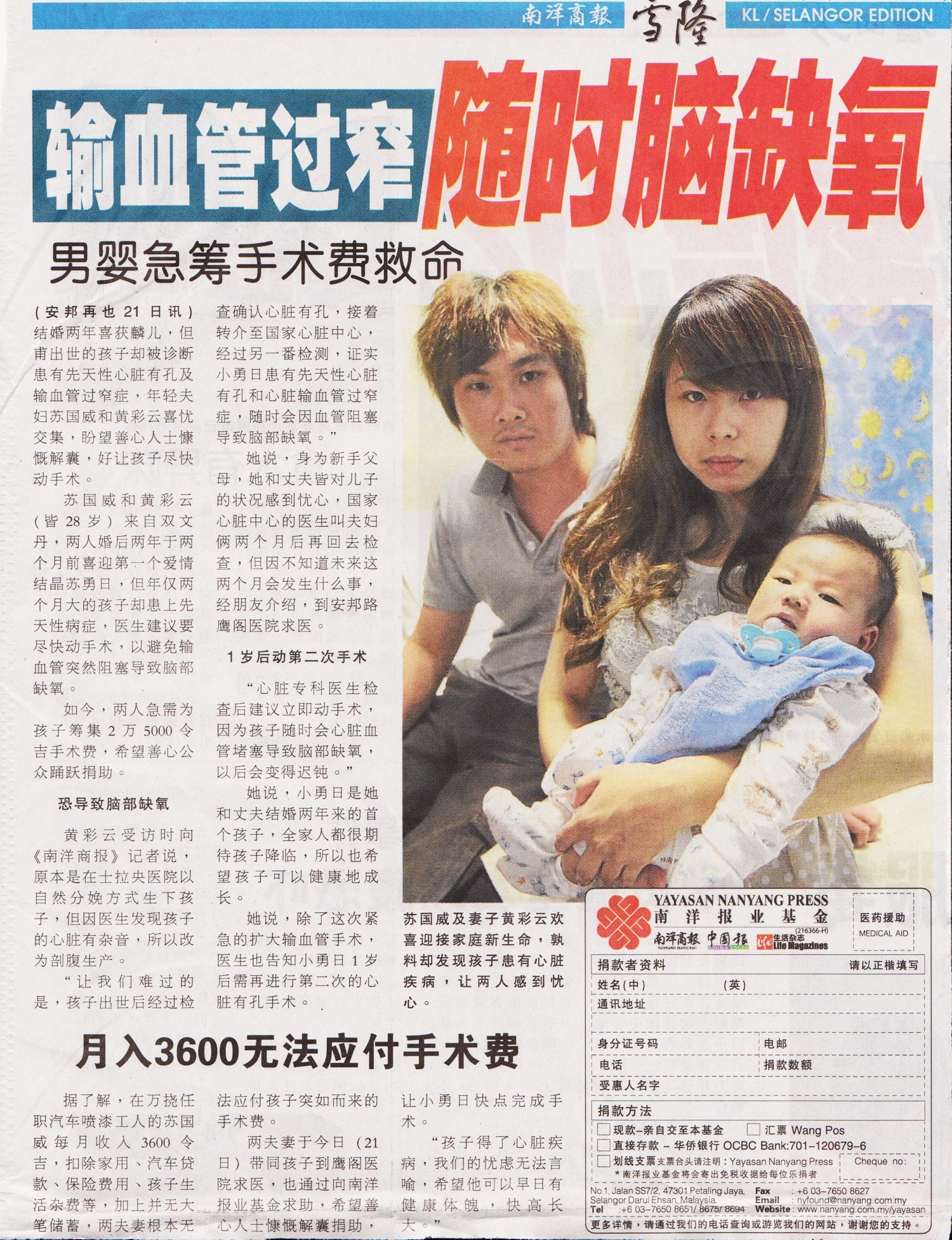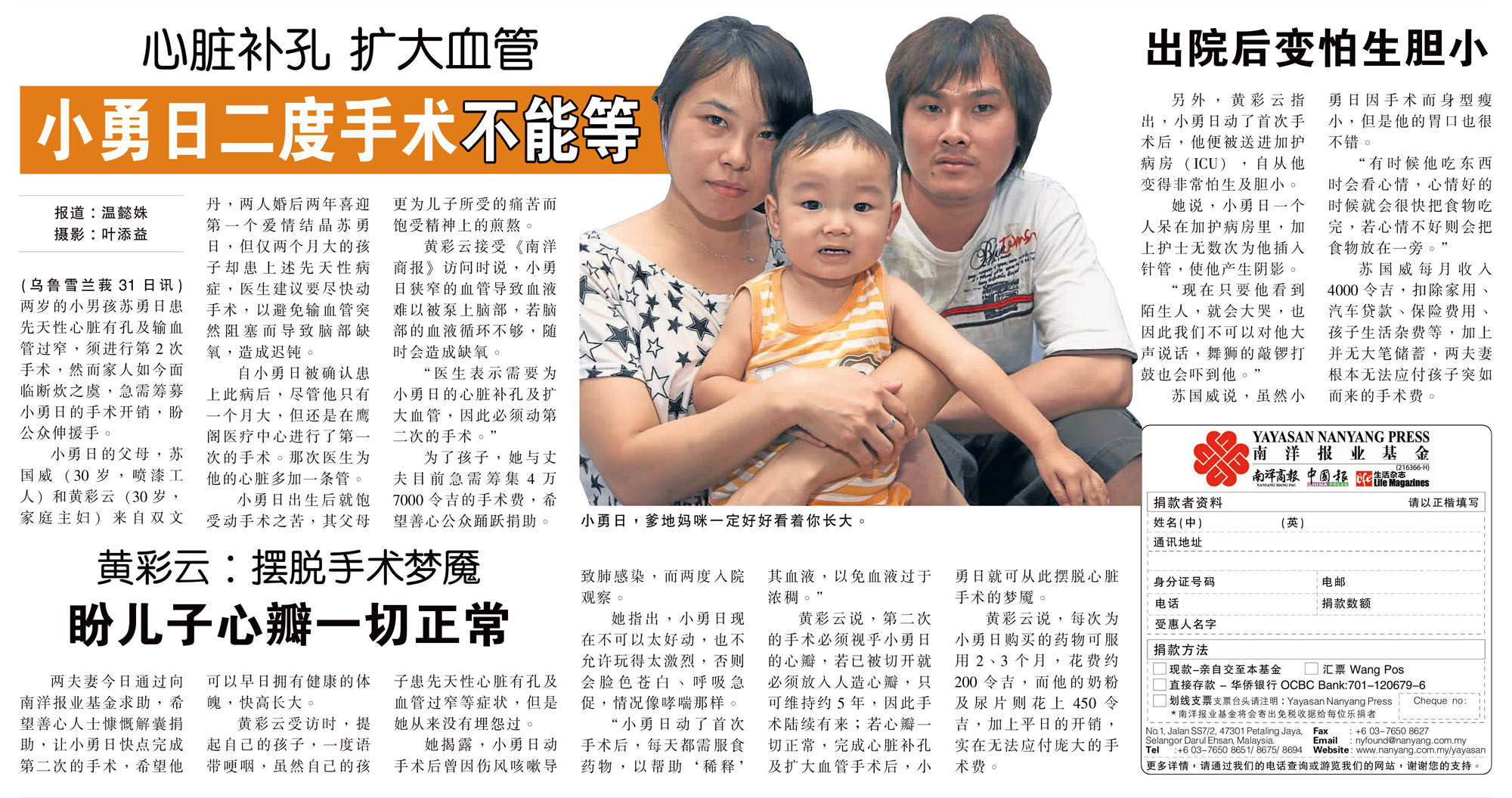 Age: 2 Condition 病情: This two-year-old boy suffers from congenital heart diseases and has to undergo a second surgery to save his life. His family lives in poverty and needs RM47,000 for his surgery. His family wishes the public can give them a helping hand in order to see him recover and grow healthily. 兩歲的小男孩蘇勇日患上先天性心臟有孔及輸血管過窄,須進行第2次手術,然而家人日今面臨斷炊之慮,急需籌募4萬7000令吉為小勇日進行手術,期 盼大眾能慷慨解囊,讓勇日可以繼續成長。 Links: – Article: Nanyang Siang Pau #1 – Article: Nanyang Siang Pau #2 – Donor List Facebook Updates 面子書最新進展: – 21/04/2014 – 21/04/2014 (2) – 25/04/2014 |