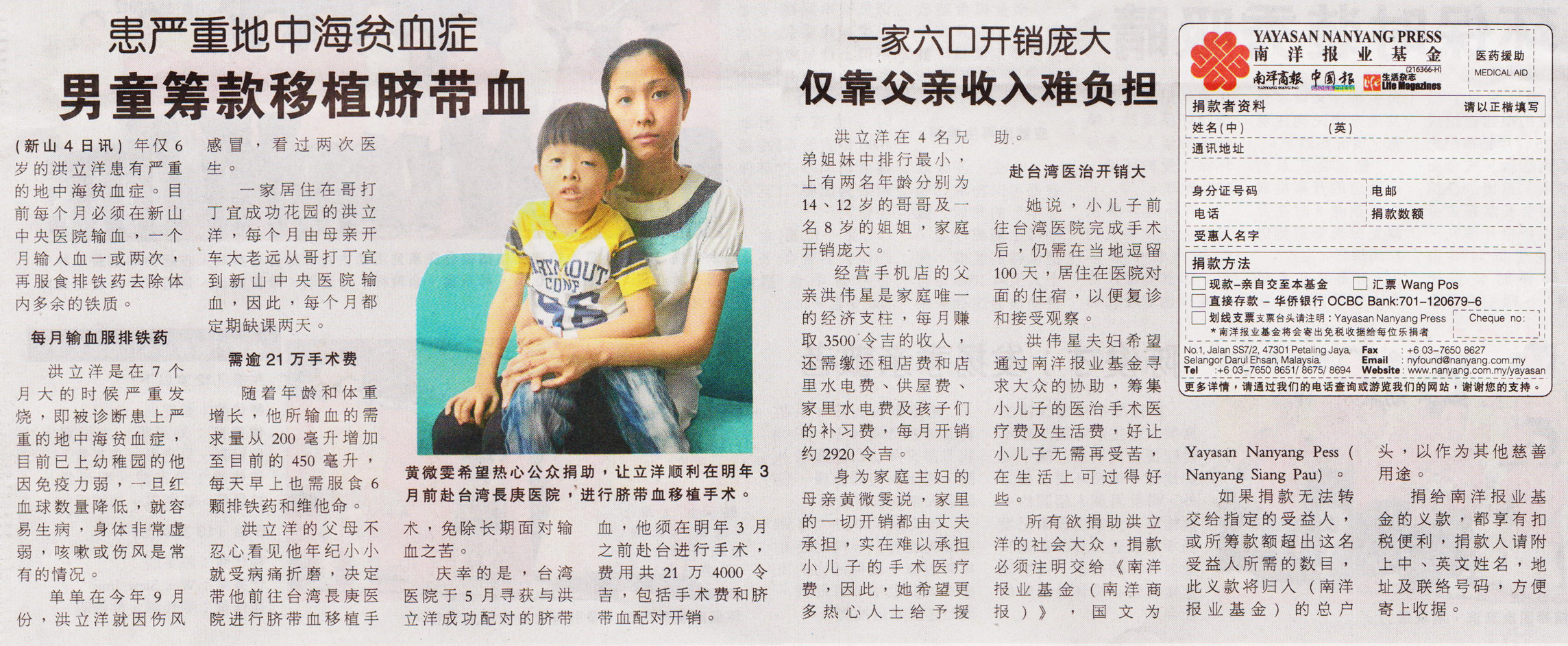 Age: 6 Condition: 患严重地中海贫血症 Links: – Article: Nanyang Siang Pau – Donor List |