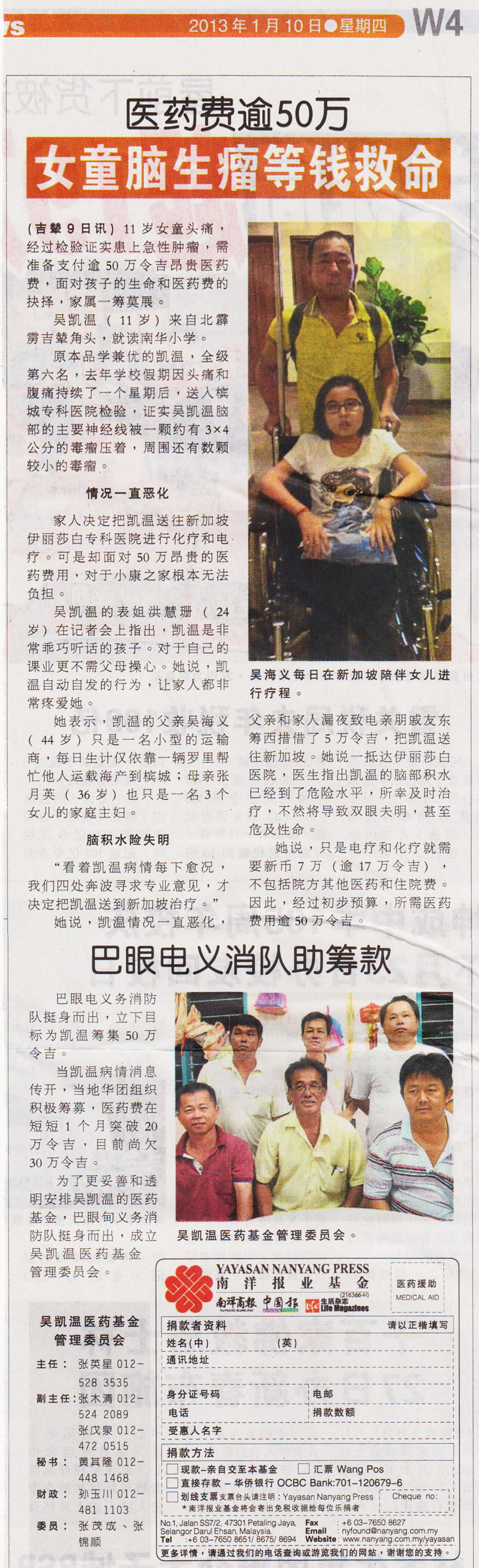 Age: 11 Condition: 患上急性肿瘤,需准备支付逾50万令吉昂贵医药费. Links: – Article: Nanyang Siang Pau – Donor List |