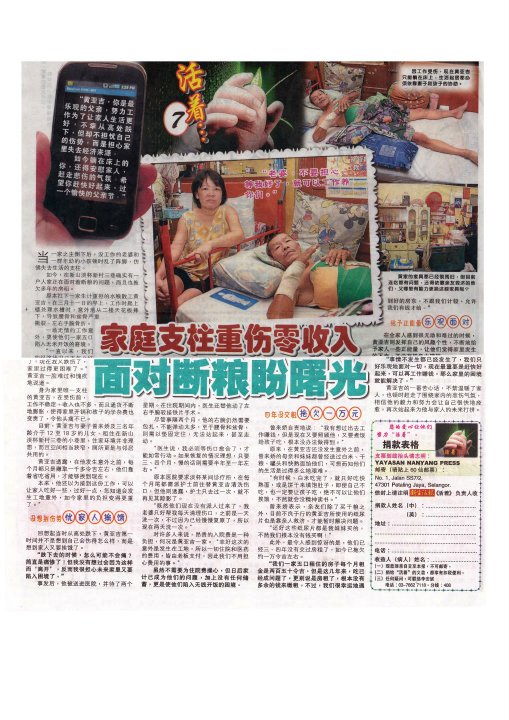 Ng hopes that he could recover as soon as possible to start earning. Yayasan Nanyang Press, hereby, urges any supporting readers to give them a helping hand.
