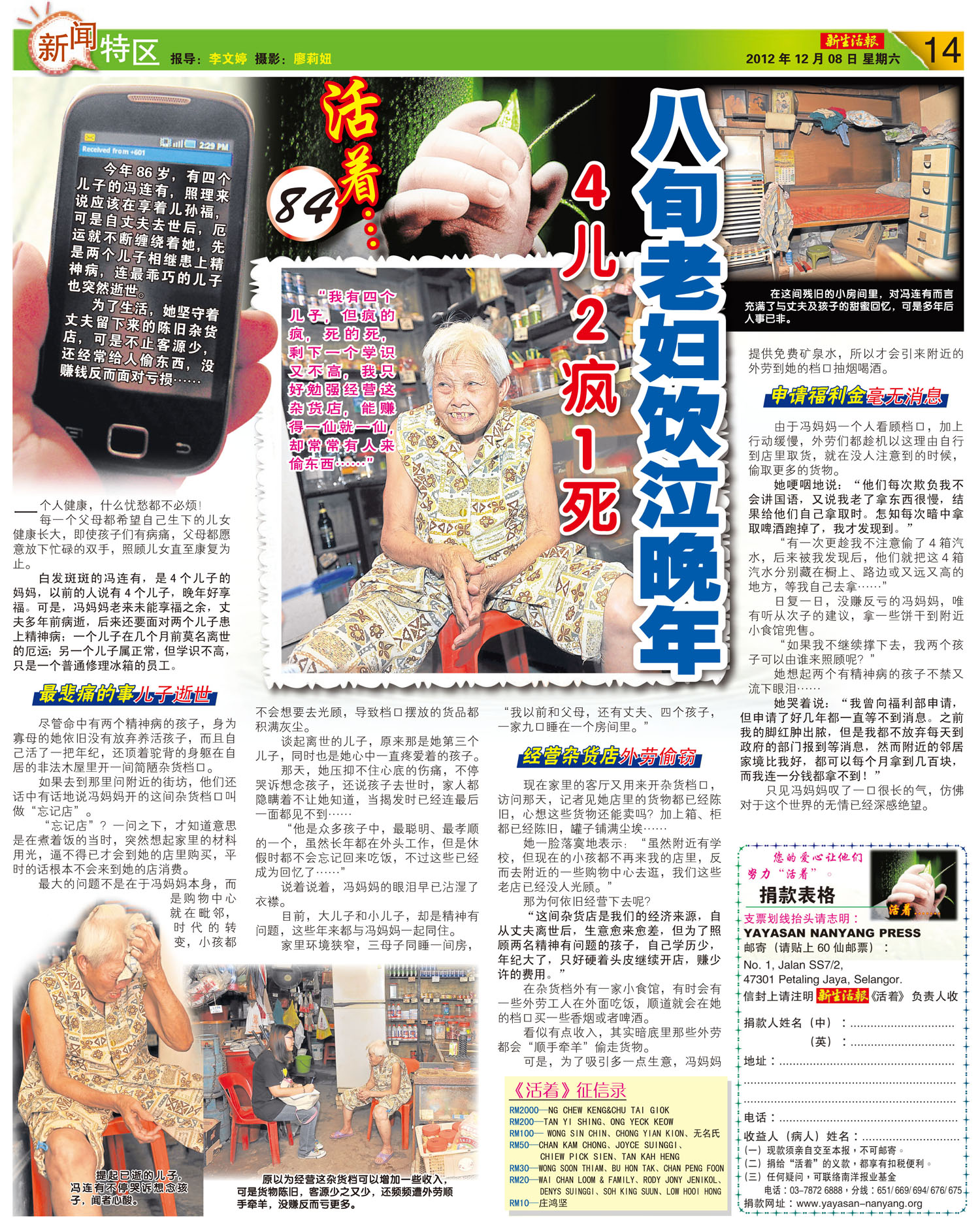 Age: 86 Condition: 丈夫去世,两个儿子患上精神病,连最乖巧的儿子也突然逝世。 Links: – Donor List |