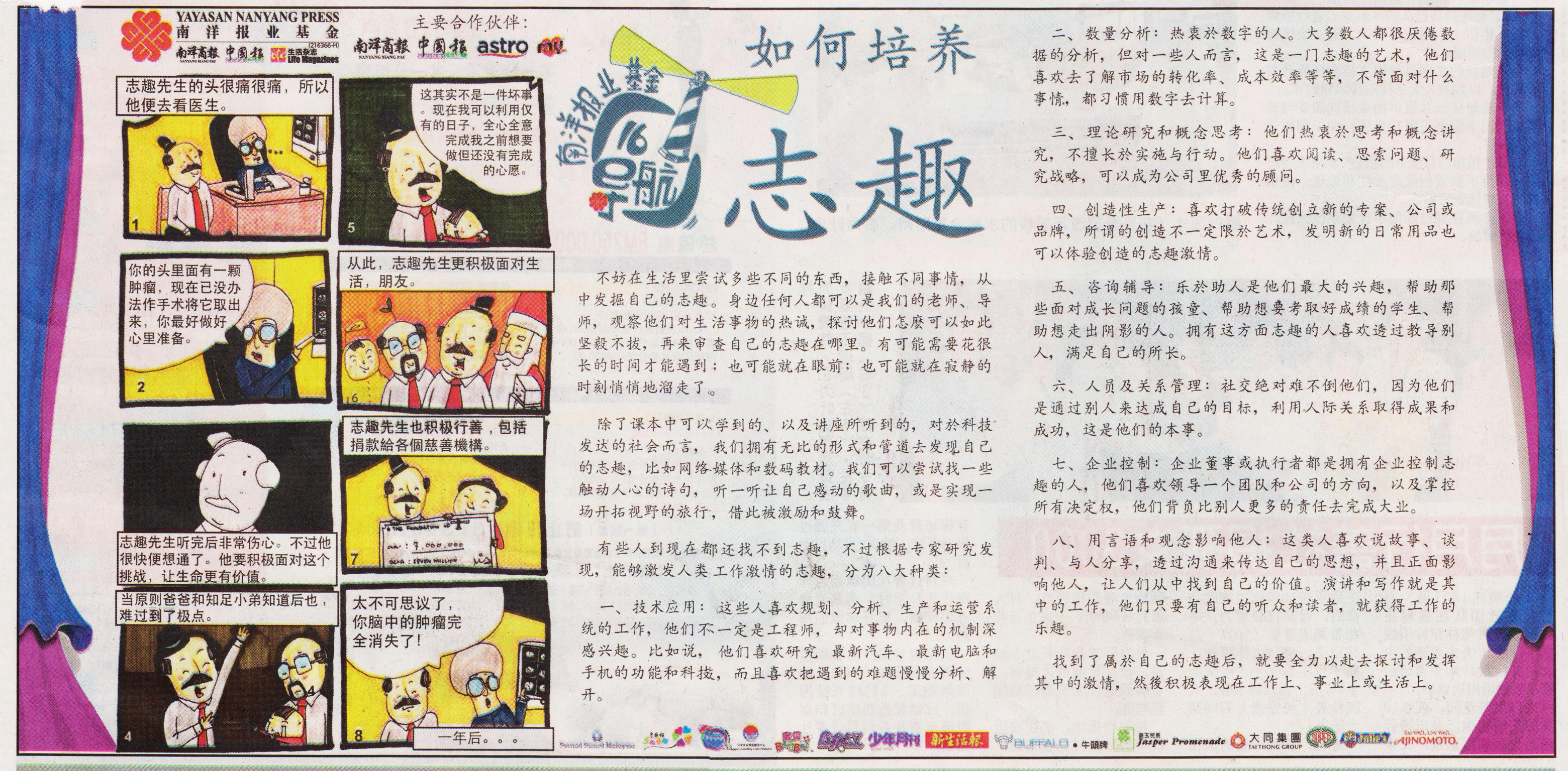 我们不妨在生活里尝试做不同的东西,接触不用的事情,从中可以发掘自己的志趣。在身边的任何人都可以成为我们的老师、导师,观察他们的对于自己要做的事情的热诚,探讨他们怎么可以如此坚毅不败,然后再来审查自己的志趣在哪里。有可能需要花很长的时间或很长的路才遇到;也可能就在眼前;也可能就在寂静的时刻悄悄地溜走。