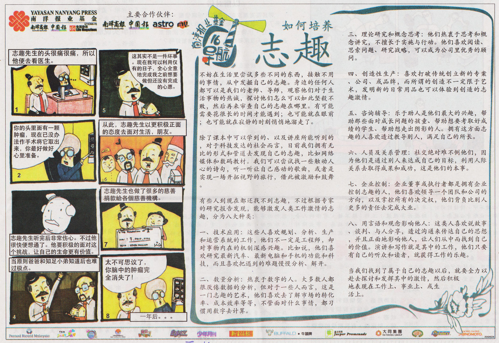 除了课本中可学到的、以及讲座所能听到的之外,以先进发达的社会来说,我们其实拥有无比的形式和管道去发现自己的志趣,比如网络媒体和数码教材。我们可以尝试去找一些触动人心的诗句,听一听感动自己的歌曲,或者是实行一场开拓视野的旅行等等,我们可以因此而被激励和鼓舞。