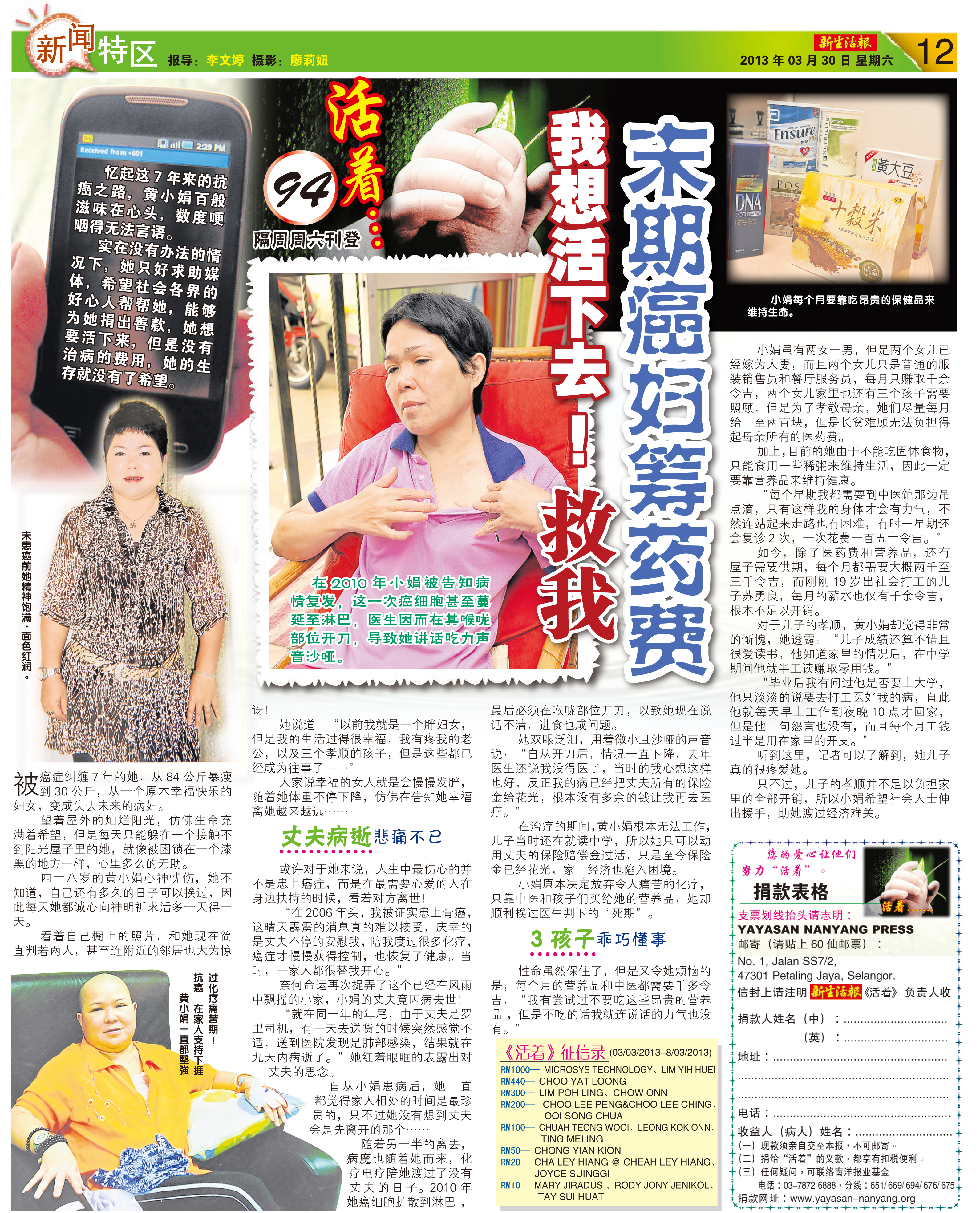 Age: 48 Condition: 患癌,蔓延至淋巴。 Links: – Donor List Last Updated: 29/1/2014 Funds Raised 筹得款项: RM3,005 Remaining Amount 剩余款项: RM1,205 Living Aids 生活援助: RM600 |