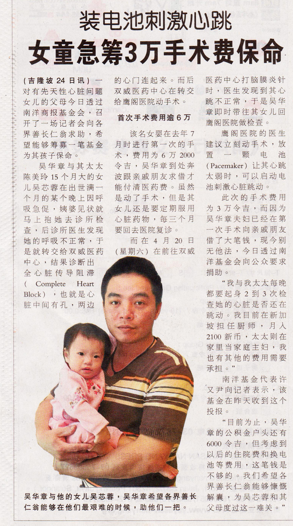 Age 年龄: 15 months 15个月 Condition 病情: Heart blocked resulting in slow heart rate 心脏中间有孔,两边的心门连起来 Links: – Article: Nanyang Siang Pau – Donor List |