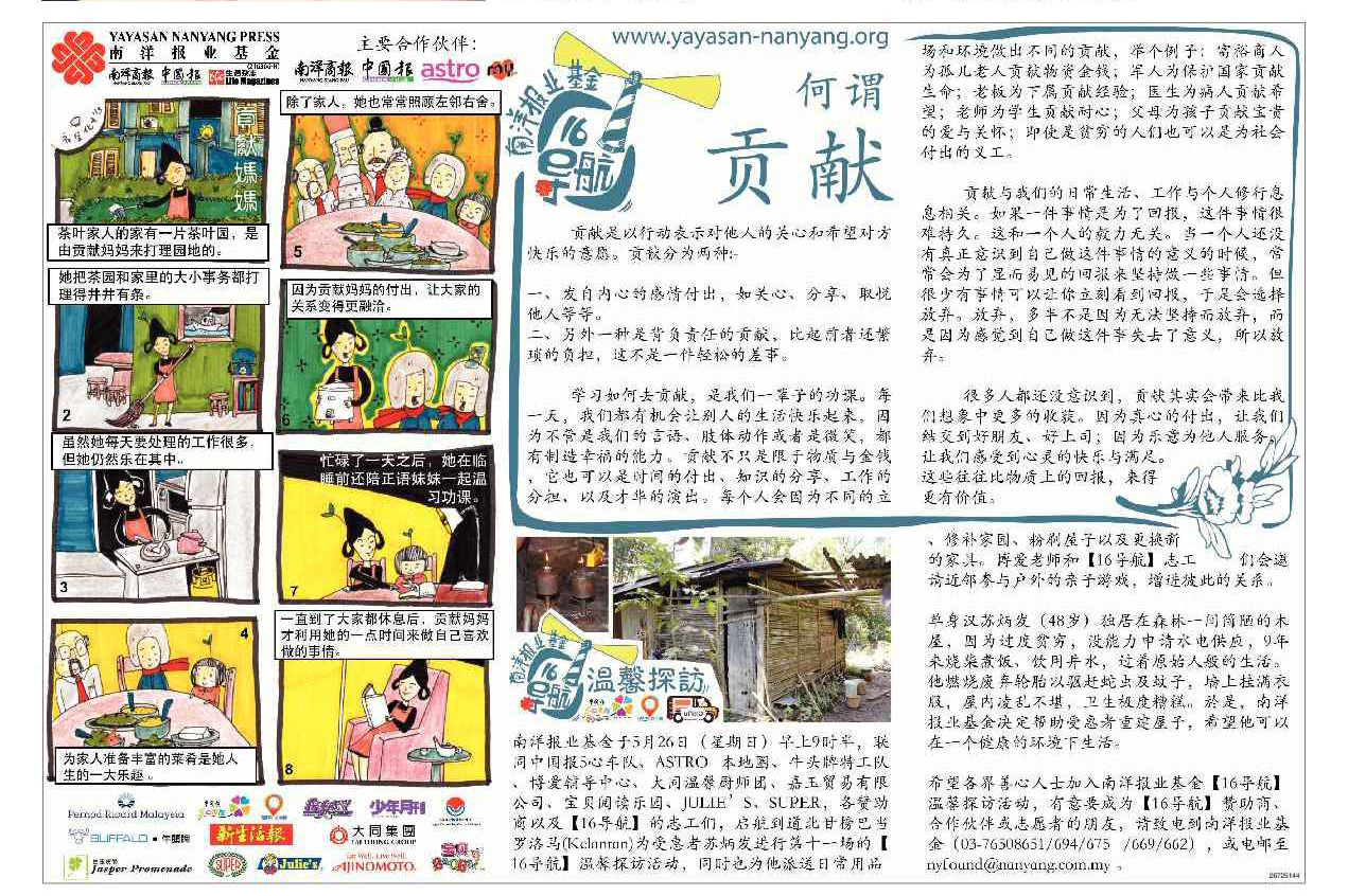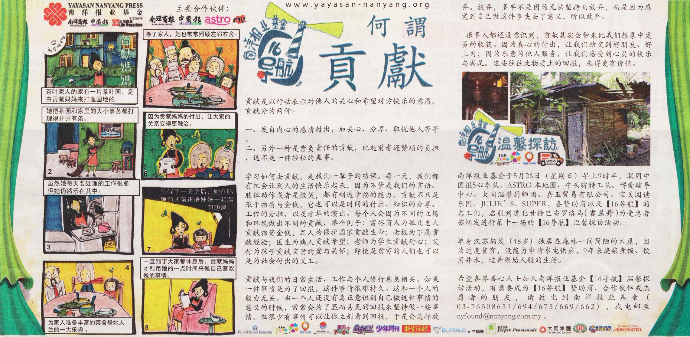 学习如何去贡献,是我们一辈子的功课。每一天,我们都有机会让别人的生活快乐起来,因为不管是我们的言语、肢体动作或者是微笑,都有制造幸福的能力。贡献不只是限于物质与金钱,它也可以是时间的付出、知识的分享、工作的分担、以及才华的演出。每个人会因为不同的立场和环境做出不同的贡献,举个例子:富裕商人为孤儿老人贡献物资金钱;军人为保护国家贡献生命;老板为下属贡献经验;医生为病人贡献希望;老师为学生贡献耐心;父母为孩子贡献宝贵的爱与关怀;即使是贫穷的人们也可以是为社会付出的义工。
