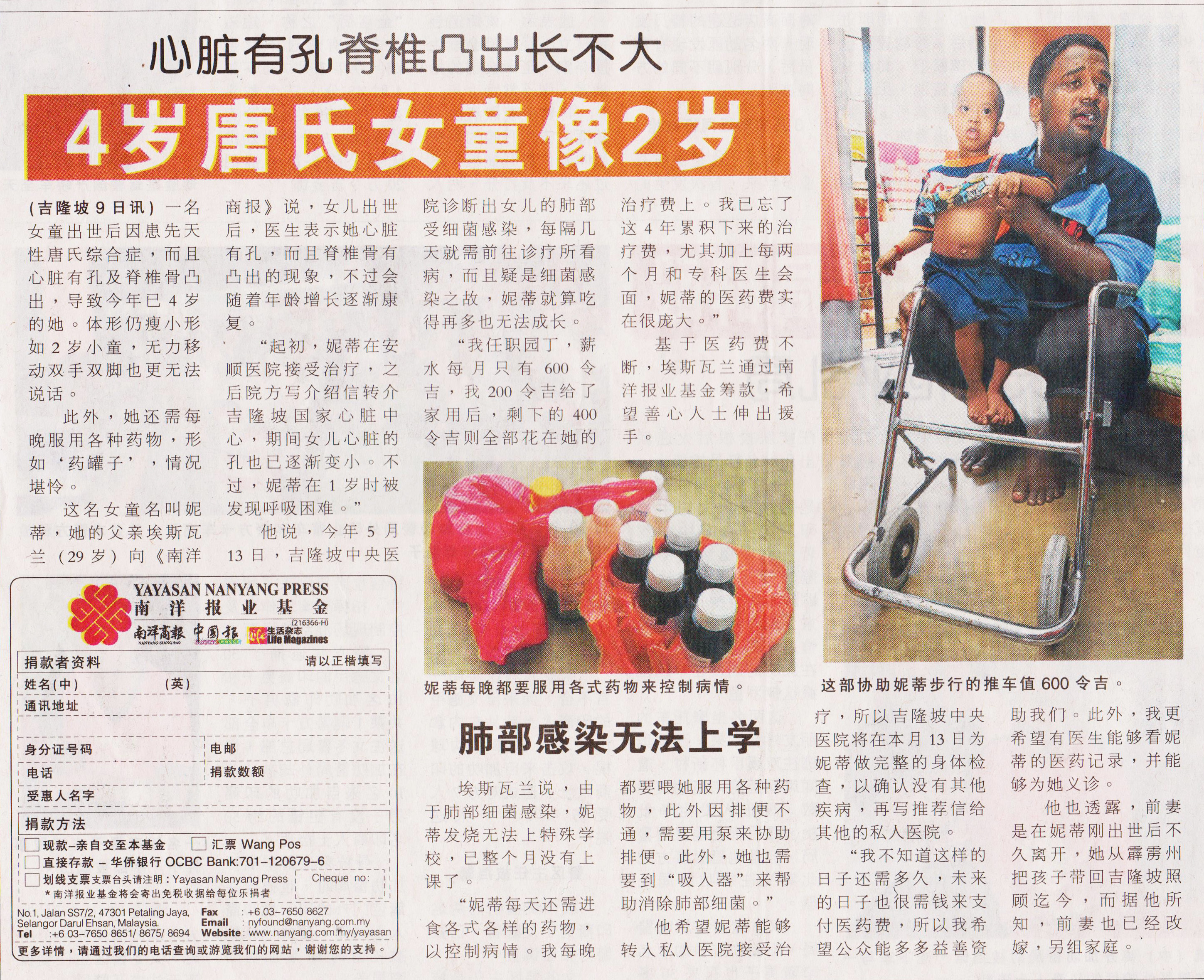 Age 年龄: 4 Condition 病情: Diagnosed with Down Syndrome, Patent Foramen Ovale (PFO) and has a spinal problem. Although she is already 4 years old, the illness makes her look like a 2-year-old child; she is unable to speak nor move her limbs. 患先天性唐氏综合症,而且心脏有孔及脊椎骨凸出,导致今年已4岁的她。体形仍瘦小形如2岁小童,无力移动双手双脚也更无法说话。 Links: – Article: Nanyang Siang Pau – Donor List |