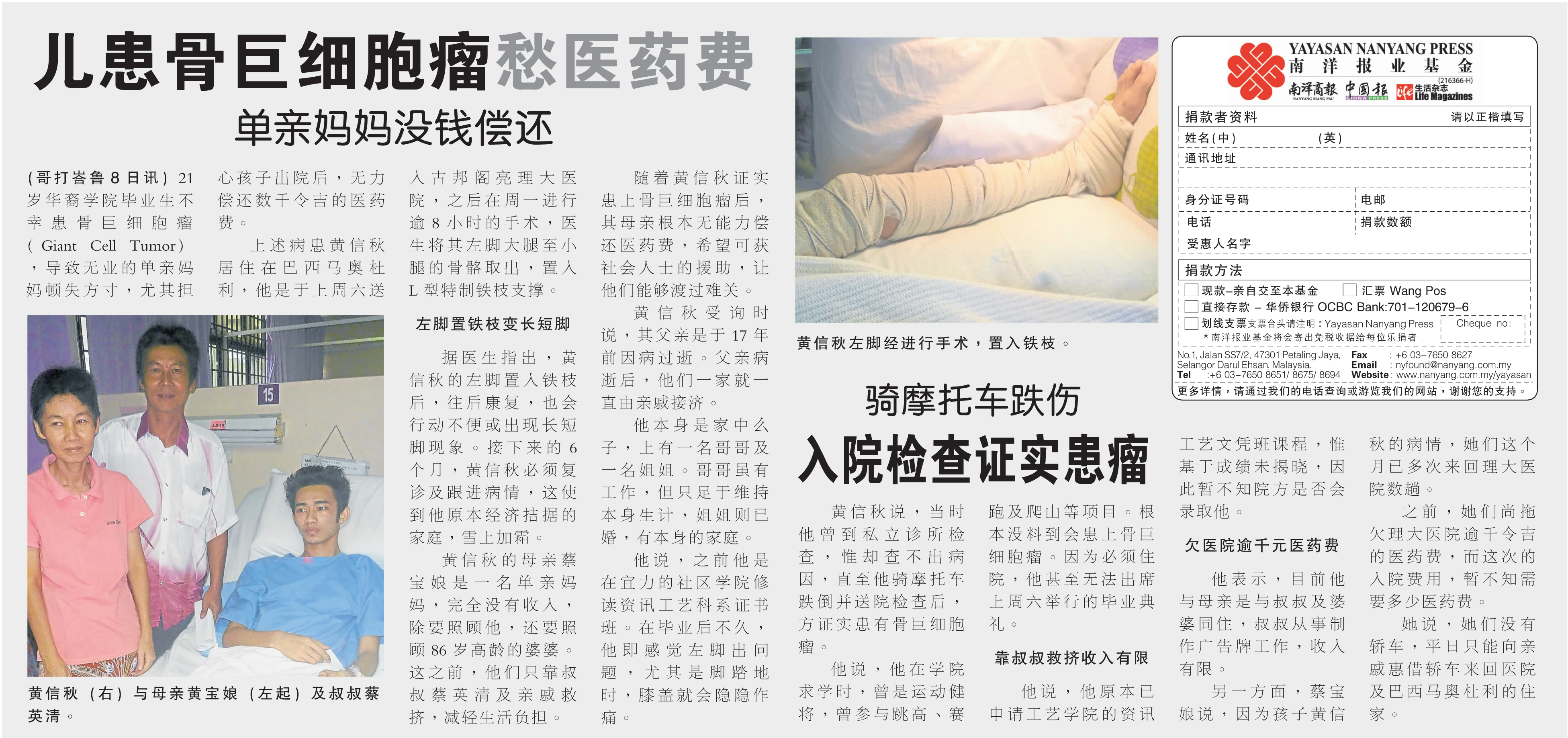 Age 年龄: 21 Condition 病情: 骨巨细胞瘤 (Giant Cell Tumor)。单亲家庭 (Single family)。 Links: – Article: Nanyang Siang Pau – Donor List |