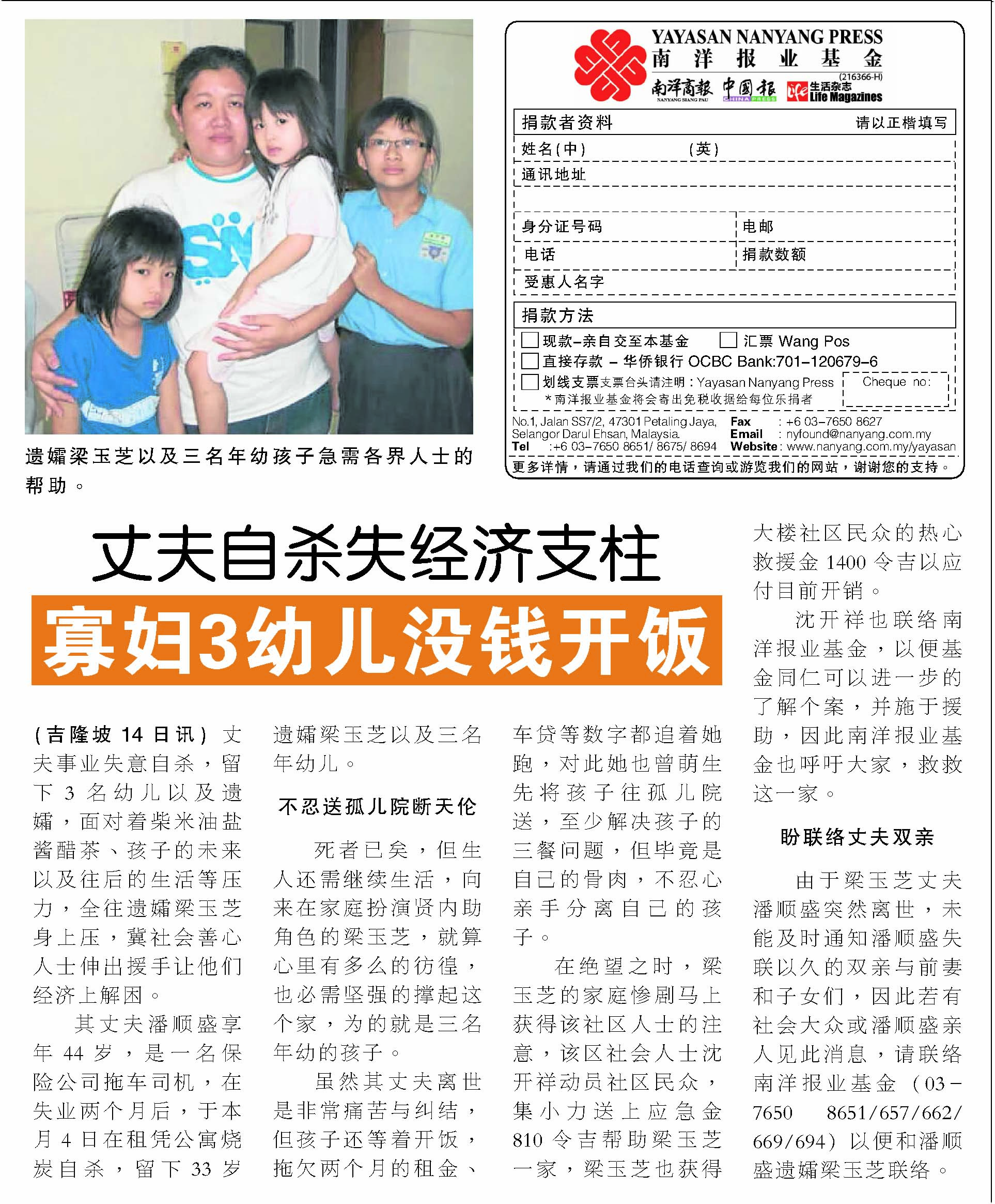 Age 年龄: 33 Condition 病情: Leong’s husband had committed suicide and left behind Leong and their three children (aged 11, 8 and 3 years old). Yayasan Nanyang Press hopes to raise funds to help solve Leong’s financial difficulties. 丈夫事业失意自杀,留下3名幼儿以及遗孀,面对着柴米油盐酱醋茶、孩子的未来以及往后的生活等压力,全往遗孀梁玉芝身上压,冀社会善心人士伸出援手让他们 经济上解困。 Links: – Article: Nanyang Siang Pau – Donor List |