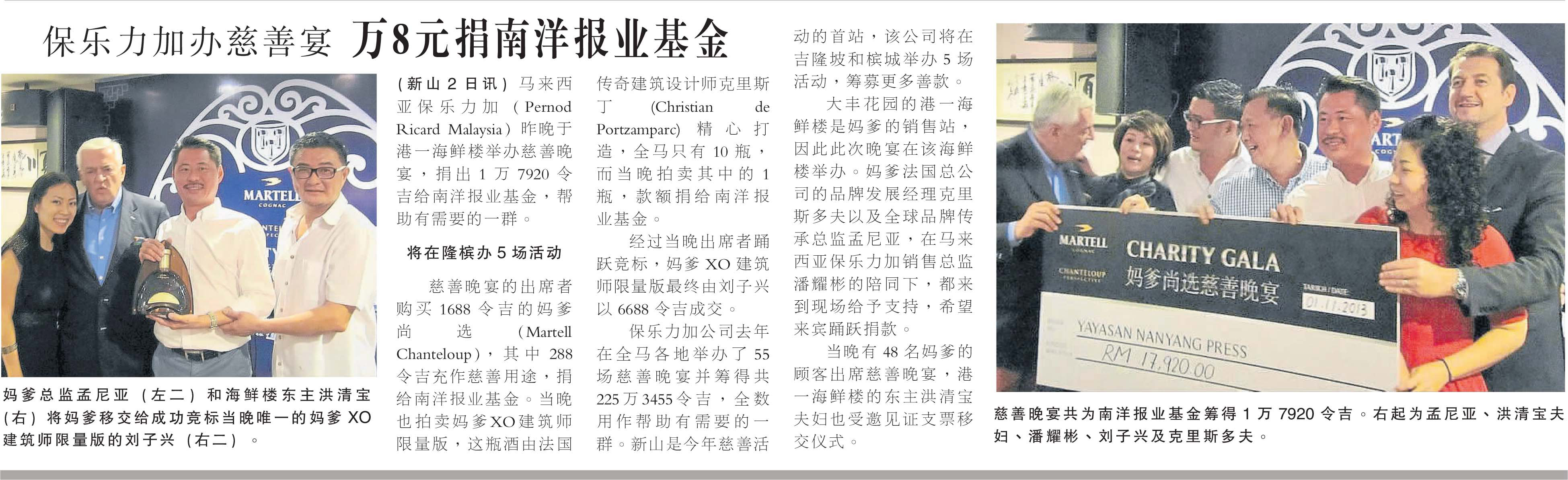 Newscut: 3 November 2013 - 保乐力加慈善宴万8元捐南洋报业基金Posted under news ·Source: Nanyang Siang Pau