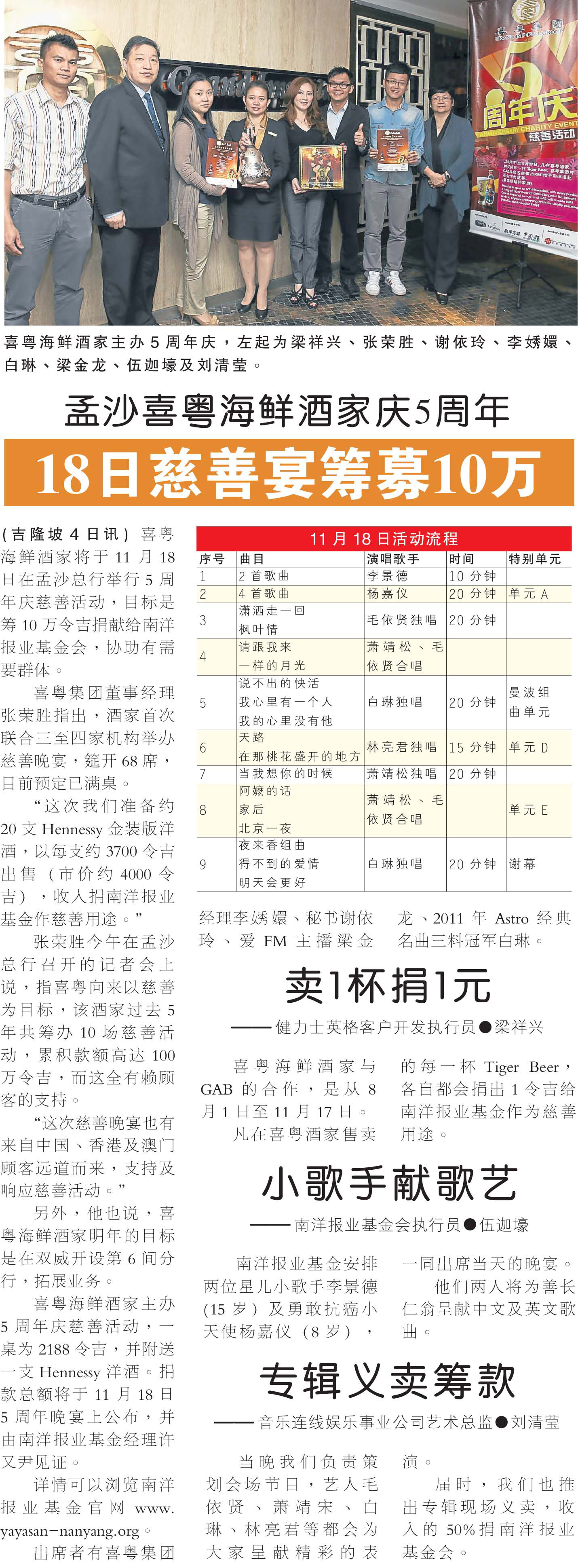 5 November 2013 - 孟沙喜粤海鲜酒家庆5周年18日慈善宴筹款10万
