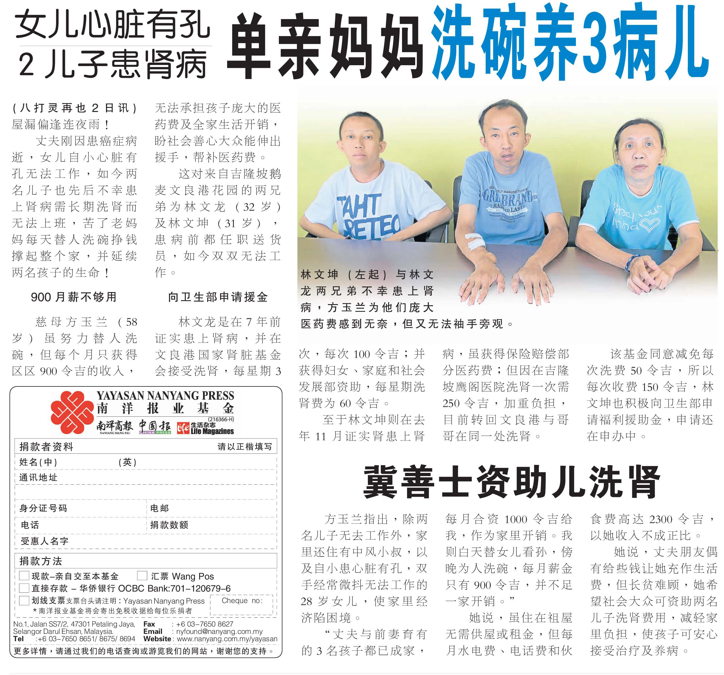 Age 年龄: 32, 30 Condition 病情: The Lims’ father just passed away from cancer, while their sister has a hole in the heart and is not able to work. Both the Lims are unable to work normally due to dialysis treatment. Lim’s mother, Fang (58 years old) needs to work to earn a living for the whole family. Yayasan Nanyang Press hopes to raise funds to help solve the Lims’ financial difficulties. 丈夫刚因患癌症病逝,女儿自小心脏有孔无法工作,如今两名儿 子也先后不幸患上肾病需长期洗肾而无法上班,苦了老妈妈每天替人洗碗挣钱撑起 整个家,并延续两 名孩子的生命! Links: – Donor List |