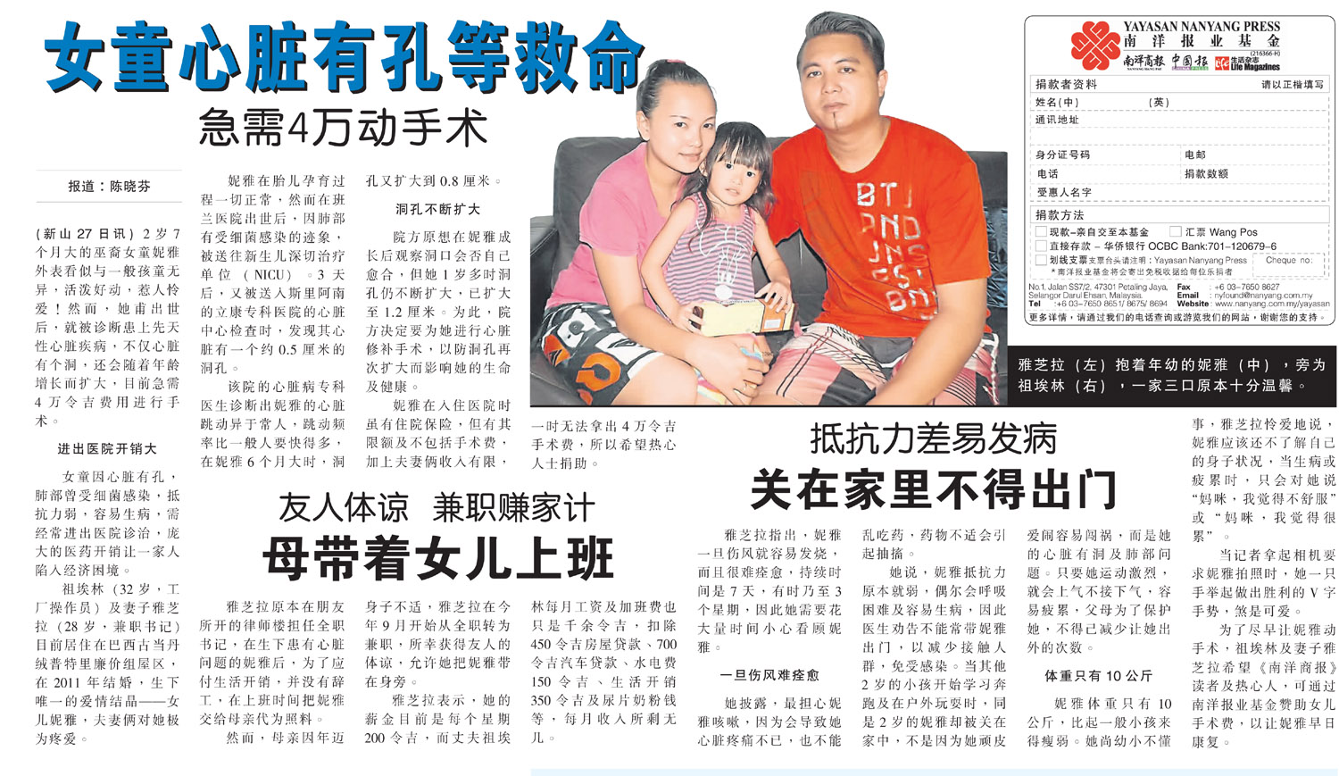 Age 年龄: 13 Condition 病情: 小女孩除了心脏有孔,被怀疑遗传了大颈包,入今被验出换上S形脊椎。 Links: – Donor List |