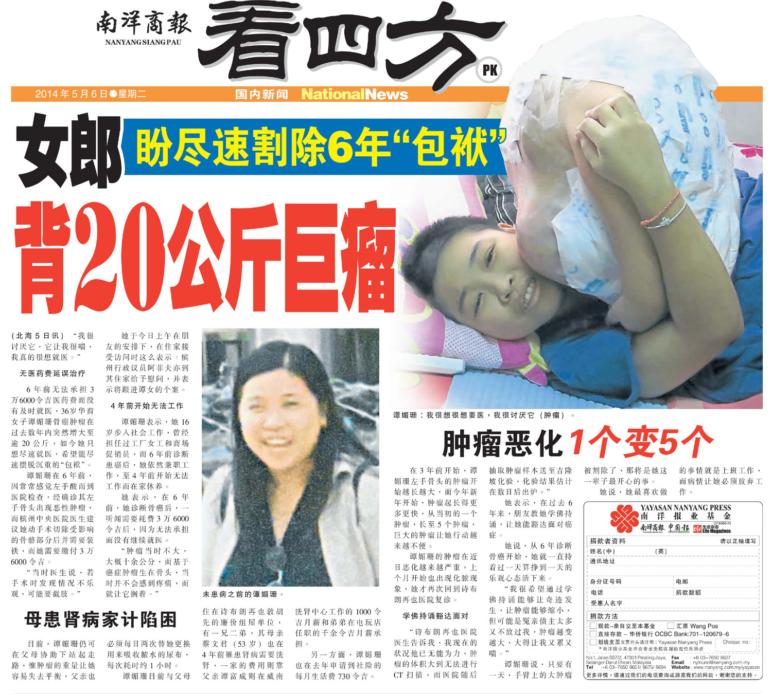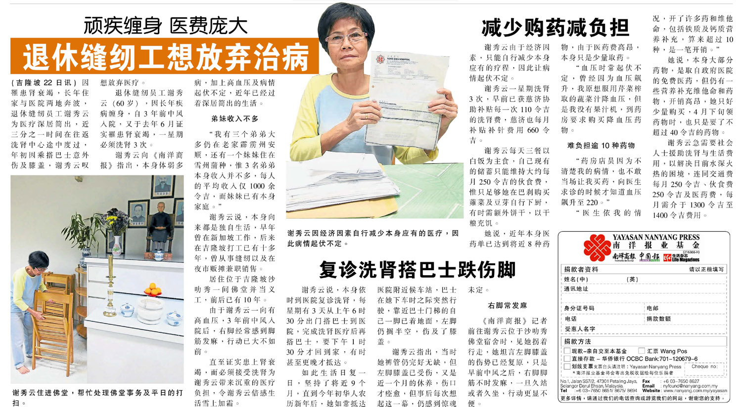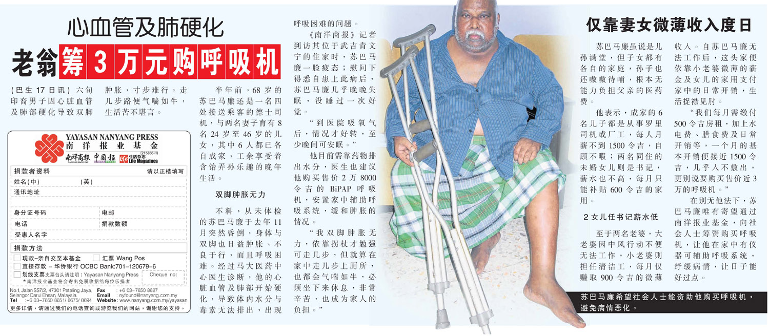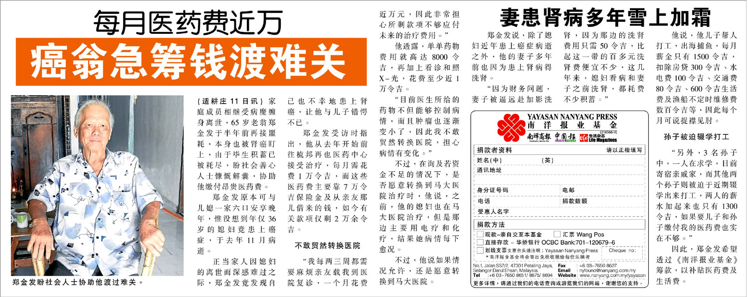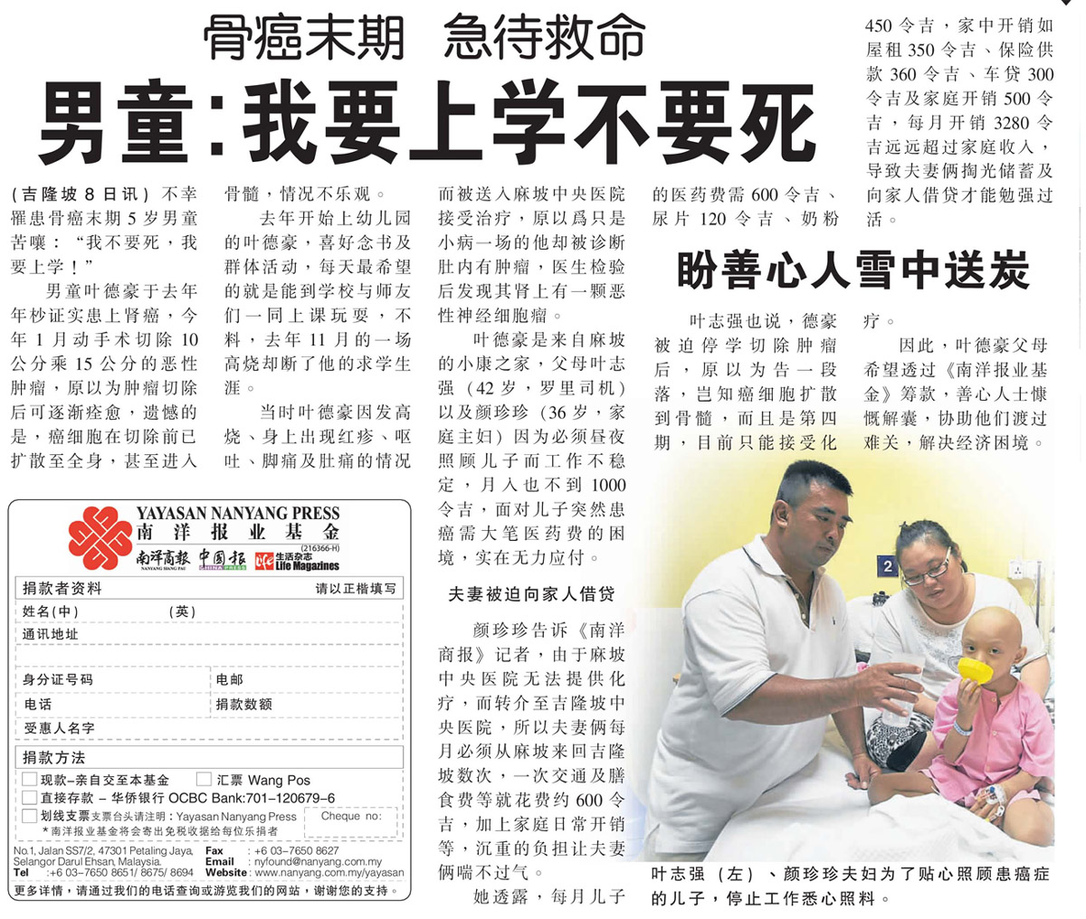 Updates 21/7/2016Yayasan Nanyang Press (YNP) expresses deep condolence for the death of Yeh De Hao at 8.30am today. YNP started to collect fund for the late of Yeh De Hao since May 2014 (total funds collected RM 41,130.50), and giving RM1000 every month as his medical expenses since then and topped up to RM2000 started from October 2015. The balance of his collected fund now is RM8033.50.