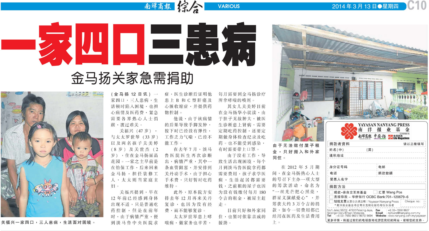 Condition 病情: Four family members, 3 illnesses. Kuan himself suffers from Hepatitis B and C, liver cancer and heart contraction disease. Kuan’s wife suffers from asthma and needs regular follow-ups, whereas their daughter Mei Ting has a swollen stomach which the doctor has diagnosed as kidney disease, requiring regular medication to control. Yayasan Nanyang Press hopes to raise funds to solve the Kuan family’s financial problems and pay for their medical treatments.