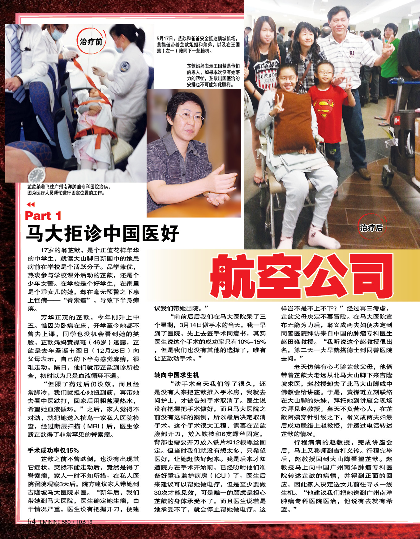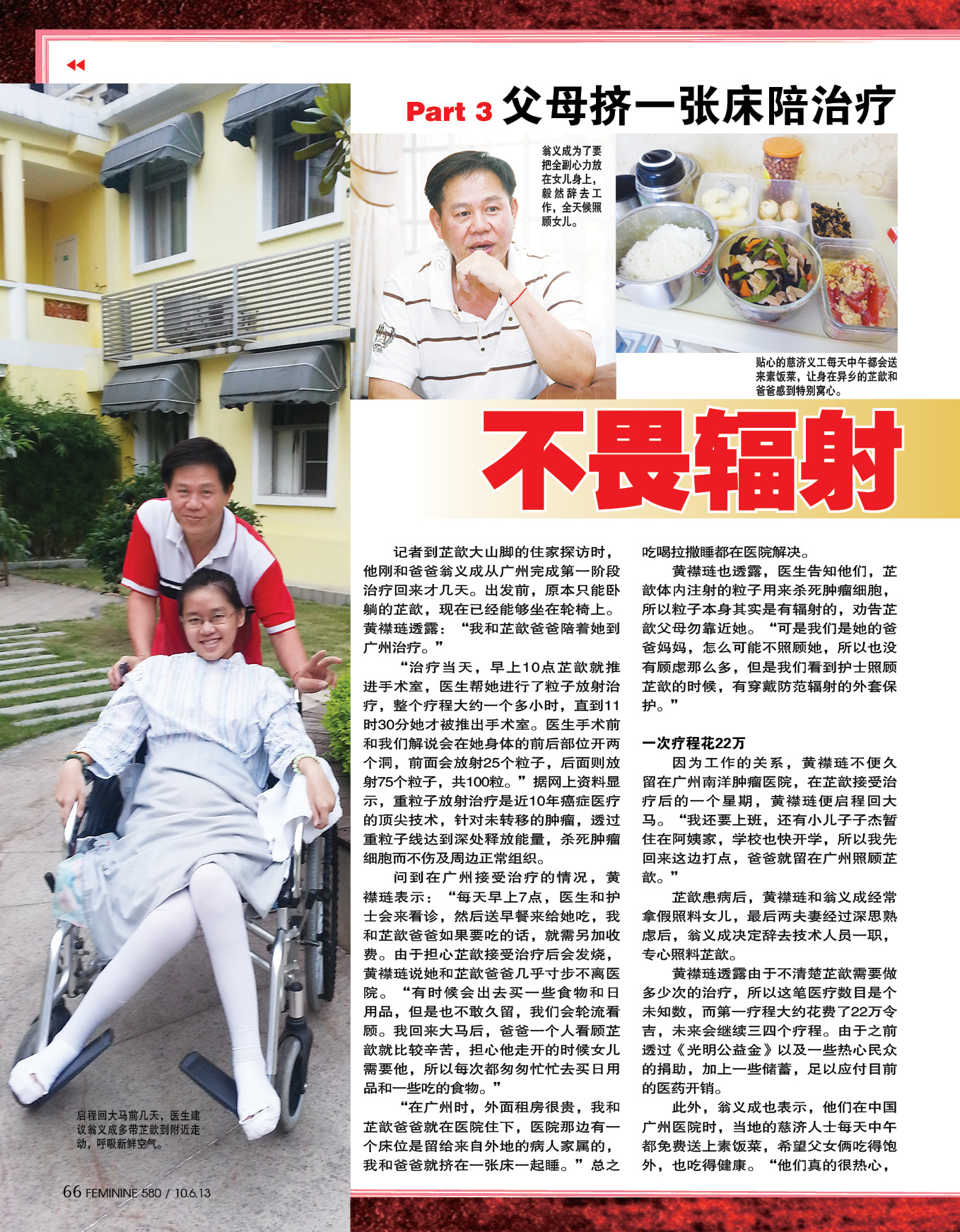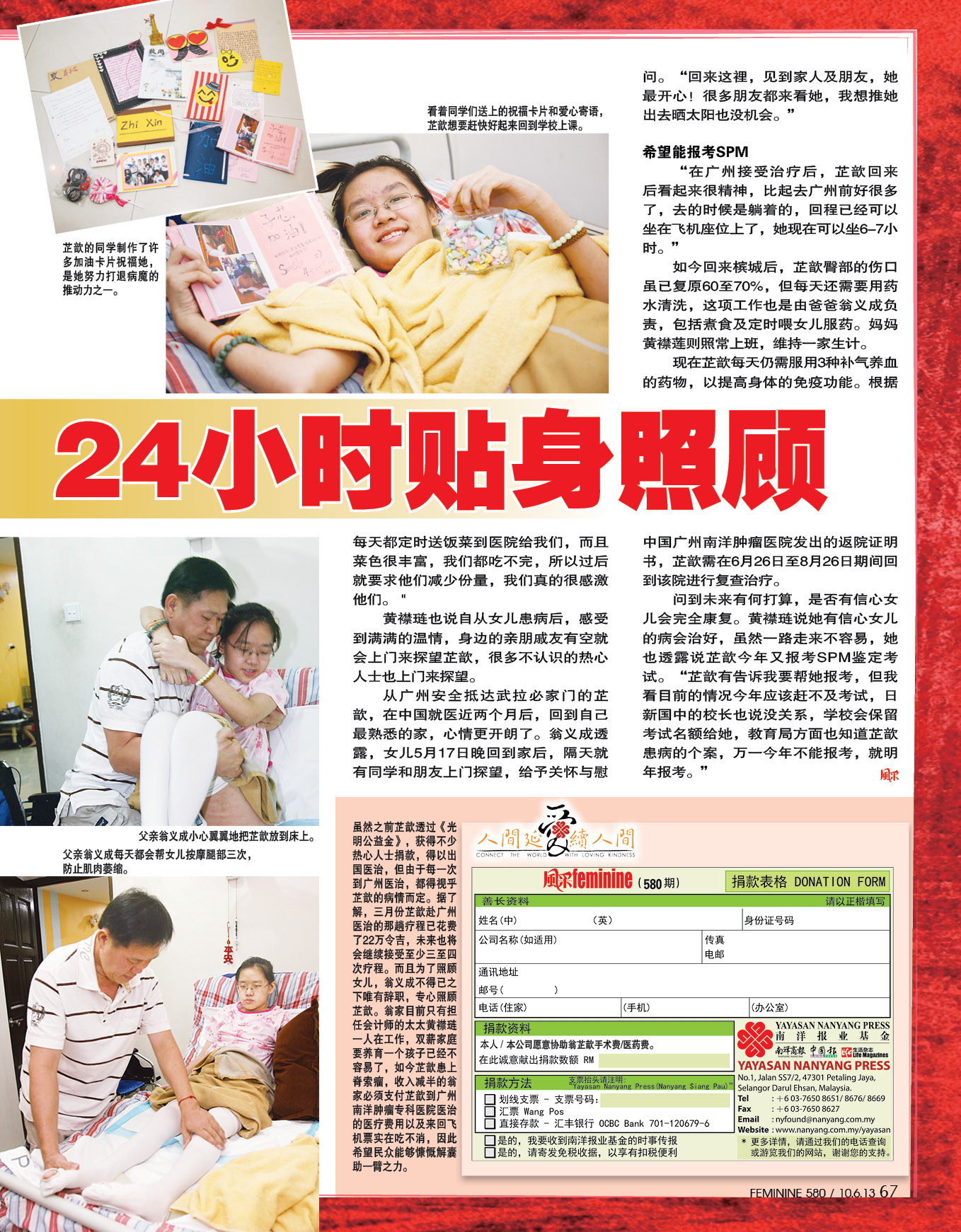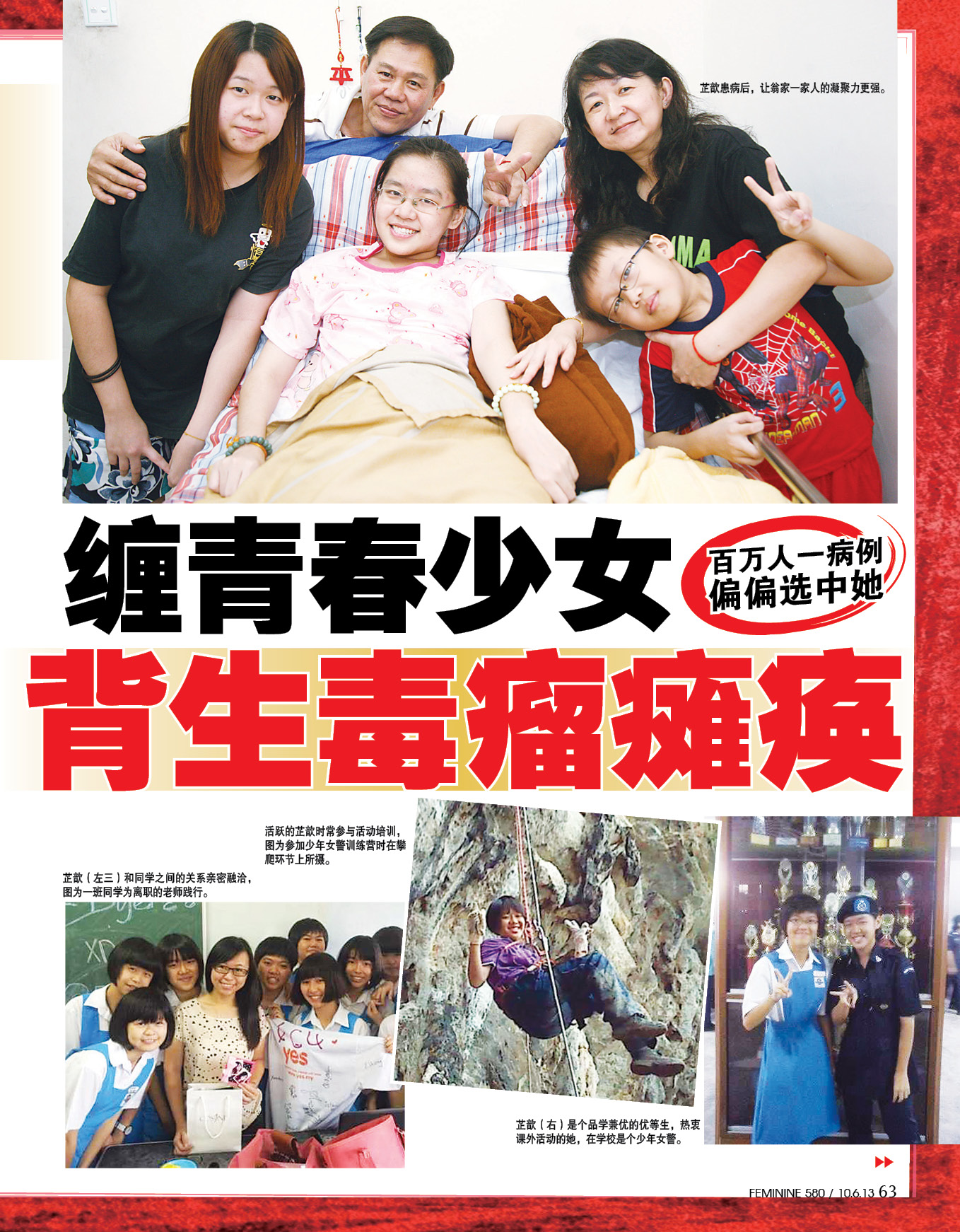 Note updated 6 March 2014: 正值花样年华乐观好动的年轻少女翁芷歆,于2012年末患上背膝瘤后历经1年的于病魔抗争后,最终不敌死神的召唤于2013年12月5日离世。虽然一年来都努力的为自己的健康奋斗也得到各方善者的给予的协助,芷歆最后在台湾接受治疗过程中离开了,离开了他最爱的家人,也离 开了这带给他病痛的尘世。芷歆生前透过南洋报业基金筹募医疗费用截至6/3共筹得RM9,306. 经基金同仁联络其家人后,芷歆家人决定将这笔捐给的芷歆的善款转捐给郑启强 (RM2,000) 与李佩仪 (RM7,306),以让这善心继续传承。南洋报业基金也将终止为芷歆筹款,感 谢各界给予芷歆的协助,谢谢。