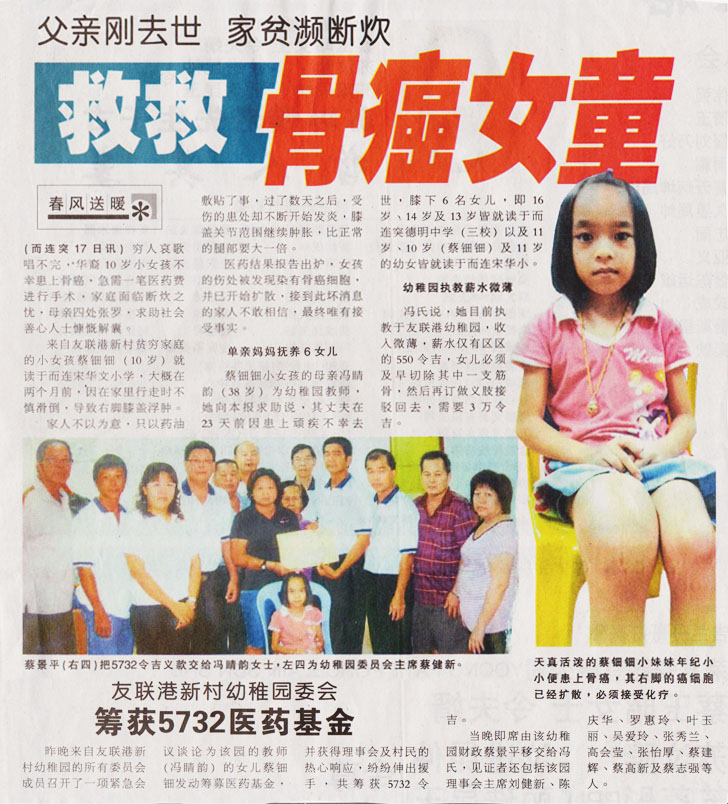 Yayasan Nanyang Press had successfully raised RM6,033.00 for Mr Lau. Yayasan will support him financially by contributing RM300.00 living expenses to him every month. The balance of his donations up to 01/04/2013 is RM5,433.00. Yayasan Nanyang Press would like to thank you for your continuous support. We hope that the public can give us a helping hand by contributing your donations to us from time to time in order to provide a better life for Mr. Lau and his family as they need our long term financial support.