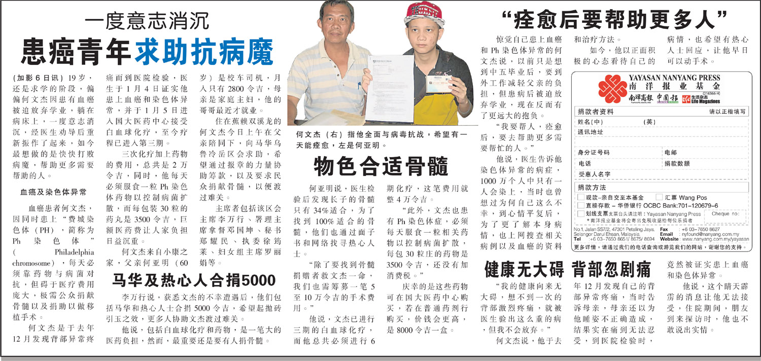 Condition 病情: 血癌患者何文杰,因同时患上“费城染色体 (PH),简称为Ph染色体” (Philadelphia chromosome),每天必须靠药物与病菌对抗,但碍于医疗费用庞大,极需公众捐献骨髓以及捐助以做移植手术。