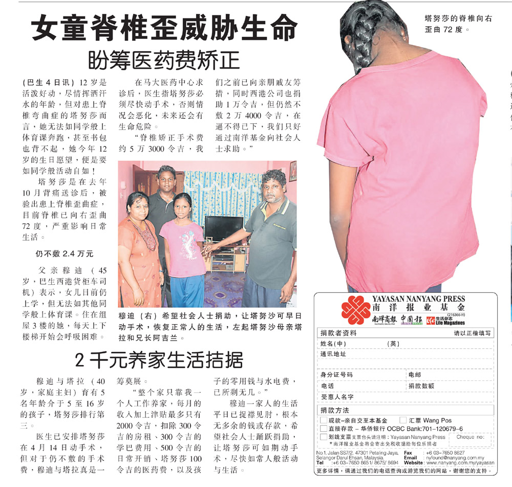 《南洋报业基金》自2015年4月开始为他筹款,共筹获 RM38,883.60,并每月拨出RM3000给他作为医疗费。至今《南洋报业基金》已拨出了RM 27,000.00给他,还剩 RM 11,883.60,只能维持他3个月的医药费。因此,希望善心人士慷慨解囊,援助他医药费。