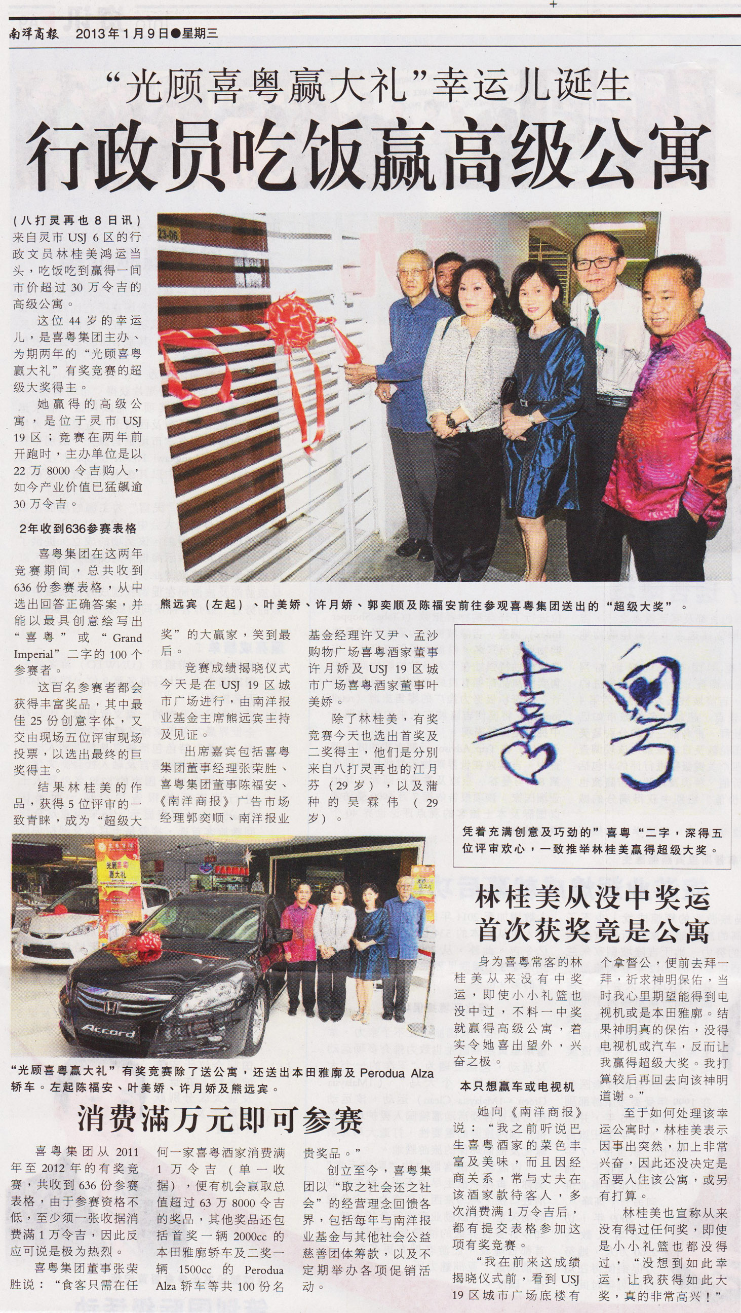 Newscut: 9 January 2013 - 光顾喜粤赢大礼幸运儿诞生